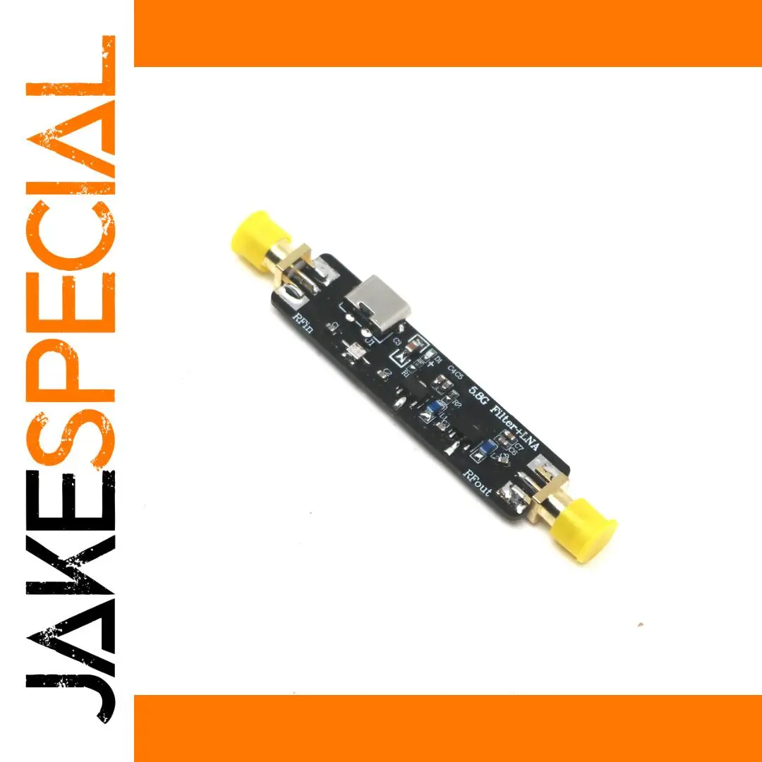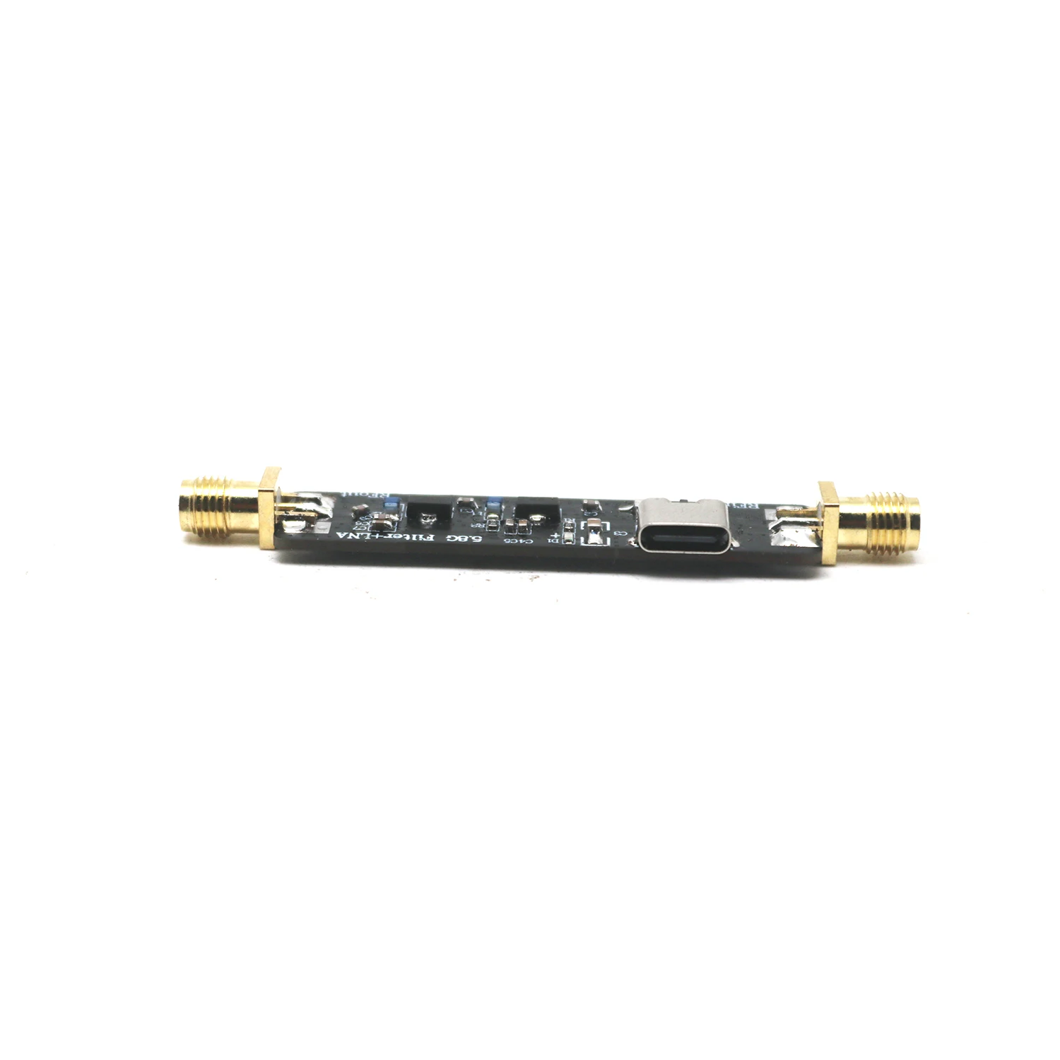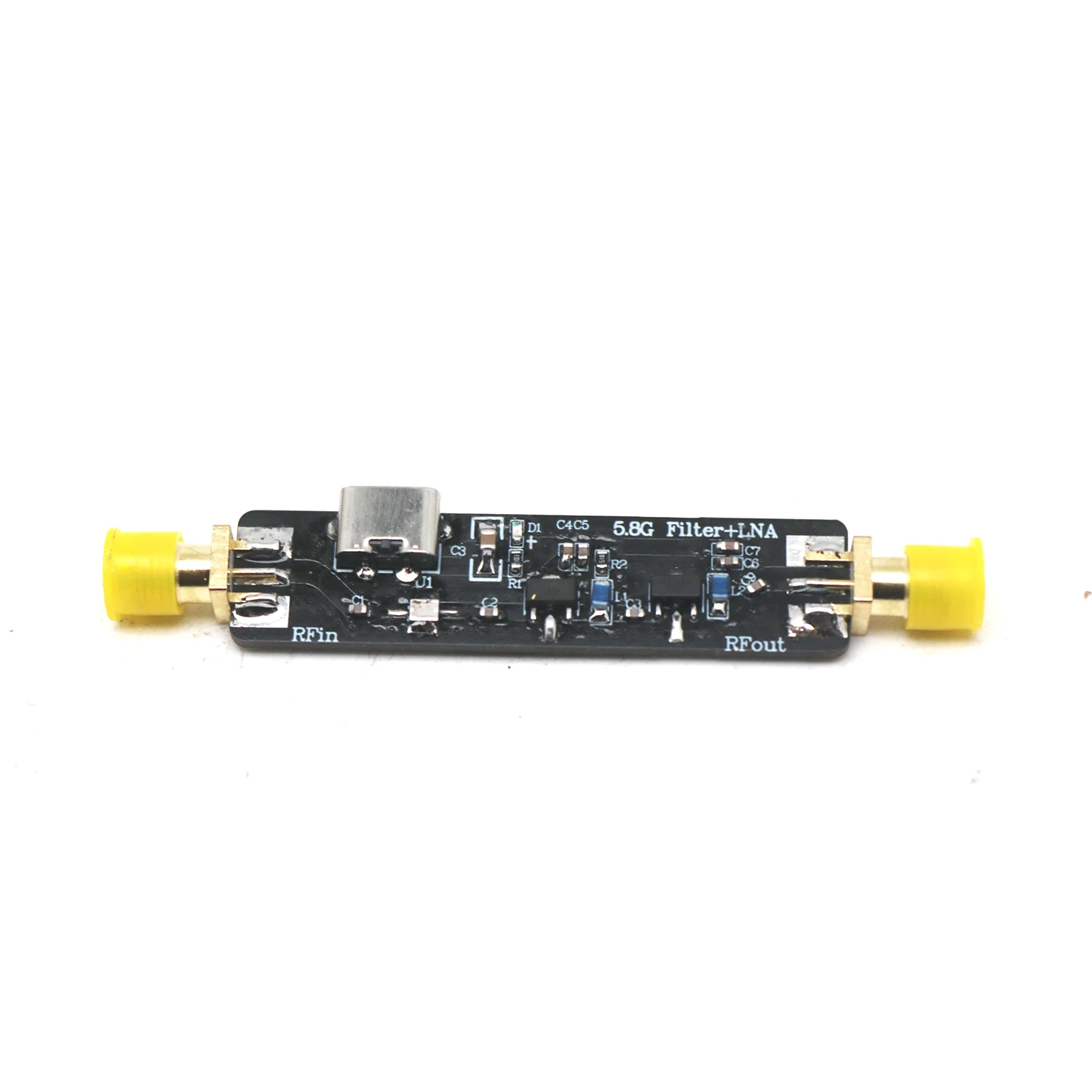 This compact 5.8GHz Low Noise Amplifier (LNA) module features a sleek black circuit board with dimensions of 72×14×6.5mm, equipped with SMA connectors—male with external thread and female with internal hole—covered by bright yellow protective caps. It offers a typical gain of 28dB, a noise figure of 2.4dB, and a P1dB output power of +10dBm, powered via a +5V Type-C interface. Designed for 5600-6000MHz applications, it includes built-in filtering for superior out-of-band signal suppression, making it ideal for WiFi, satellite, and drone image transmission in space-constrained setups.