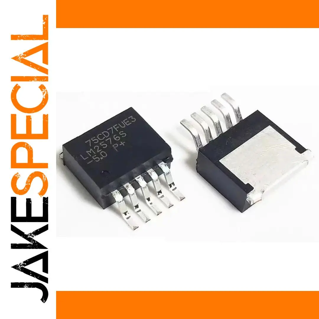 Enhance your power management projects with this set of five LM2576 voltage regulator modules, including models LM2576S-3V3, LM2576S-5V0, LM2576S-12, LM2576S-15, and LM2576S-ADJ, all housed in robust TO263-5 packages. These new logic ICs offer high efficiency and reliable performance, suitable for applications requiring fixed output voltages of 3.3V, 5V, 12V, 15V, or an adjustable voltage option. Designed for easy integration with standard input voltages, they feature a sleek black plastic body complemented by metallic pins and a metallic heat sink or thermal pad on the underside, ensuring excellent heat dissipation during operation.