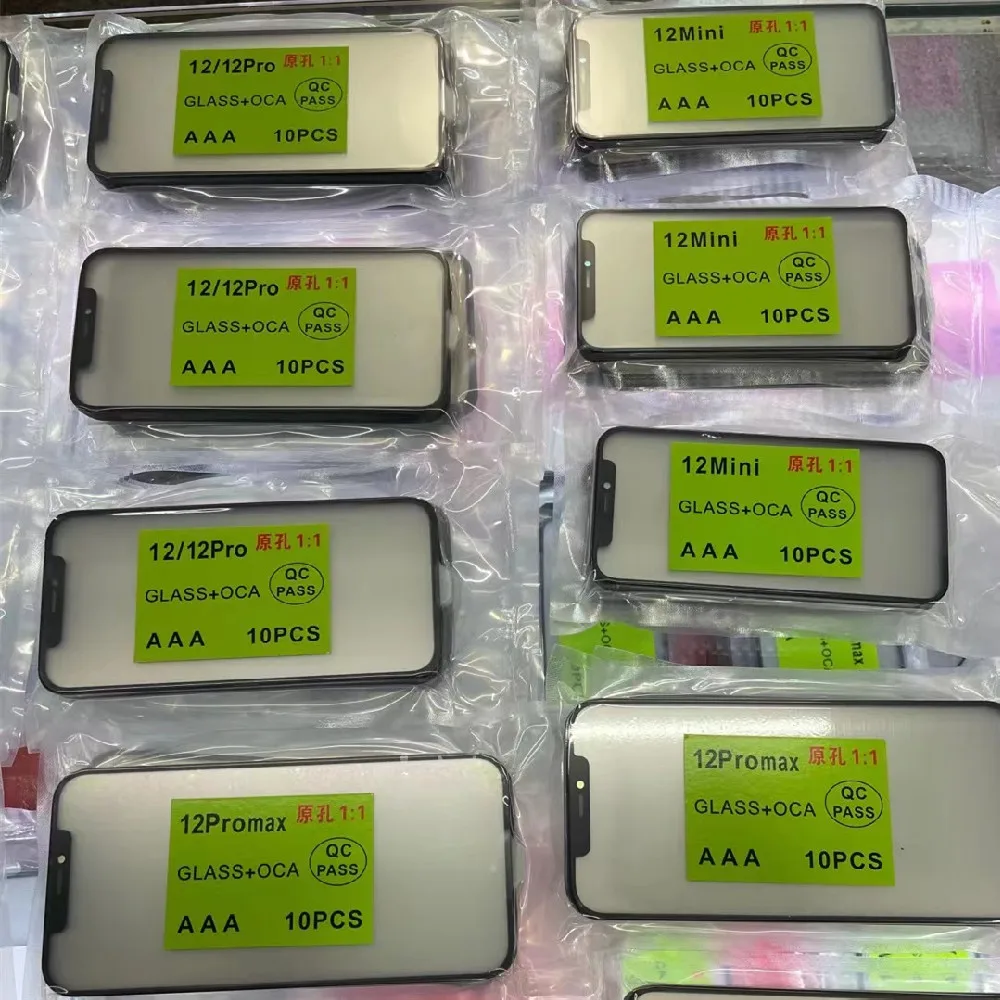 Designed for optimum touch sensitivity and clarity, this 5-piece set of front glass lens panels enhances your iPhone experience. Each lens is crafted from high-quality materials to achieve durability and a sleek finish. They are compatible with a range of iPhone models, including 12 Mini, 12, 12 Pro, 12 Pro Max, 13, 13 Pro, 13 Pro Max, 14, 14 Pro, 14 Plus, 15, 15 Pro, and 16 series. The clear surface, framed in a thin black outline, ensures maximum visibility while blending seamlessly with the device's aesthetic. Each lens comes with a blue adhesive strip for ease of installation and handling. Elevate your phone's functionality and style by investing in this essential repair part today!