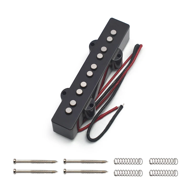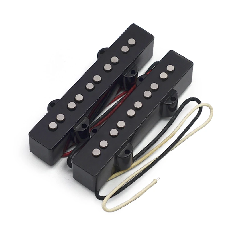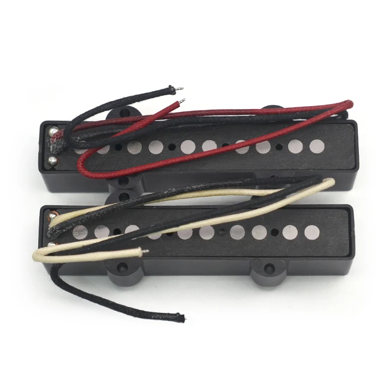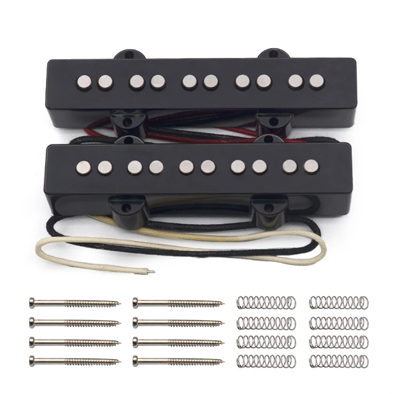 Experience a rich, punchy tone with this set of this high-quality Alnico 5 pickups designed for 5-string Jazz Bass guitars. These pickups feature an open style with solid flat pole pieces made of metal, providing clear articulation and a vintage-style aesthetic. The black plastic split covers give them a sleek, modern look, while the fiber bobbins and wax-potted braided cloth wiring ensure durability and optimal sound quality. With precise pole spacing—67mm for the neck and 70.5mm for the bridge—these pickups are perfect for delivering balanced output across all five strings. Whether you're recording or performing live, these pickups offer exceptional tone clarity and sustain, elevating your musical experience. They come complete with mounting screws and springs, allowing for easy installation and secure fit on your guitar.