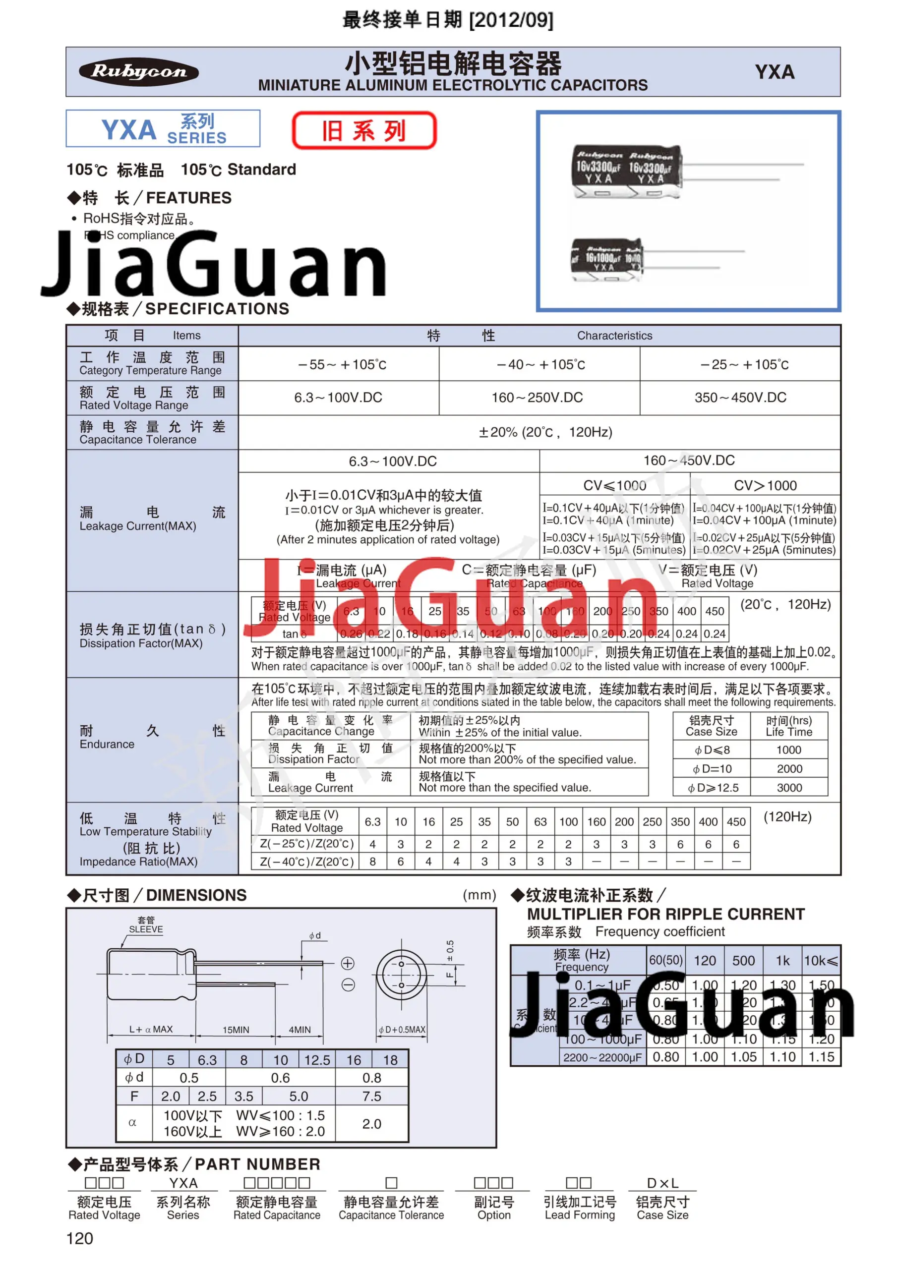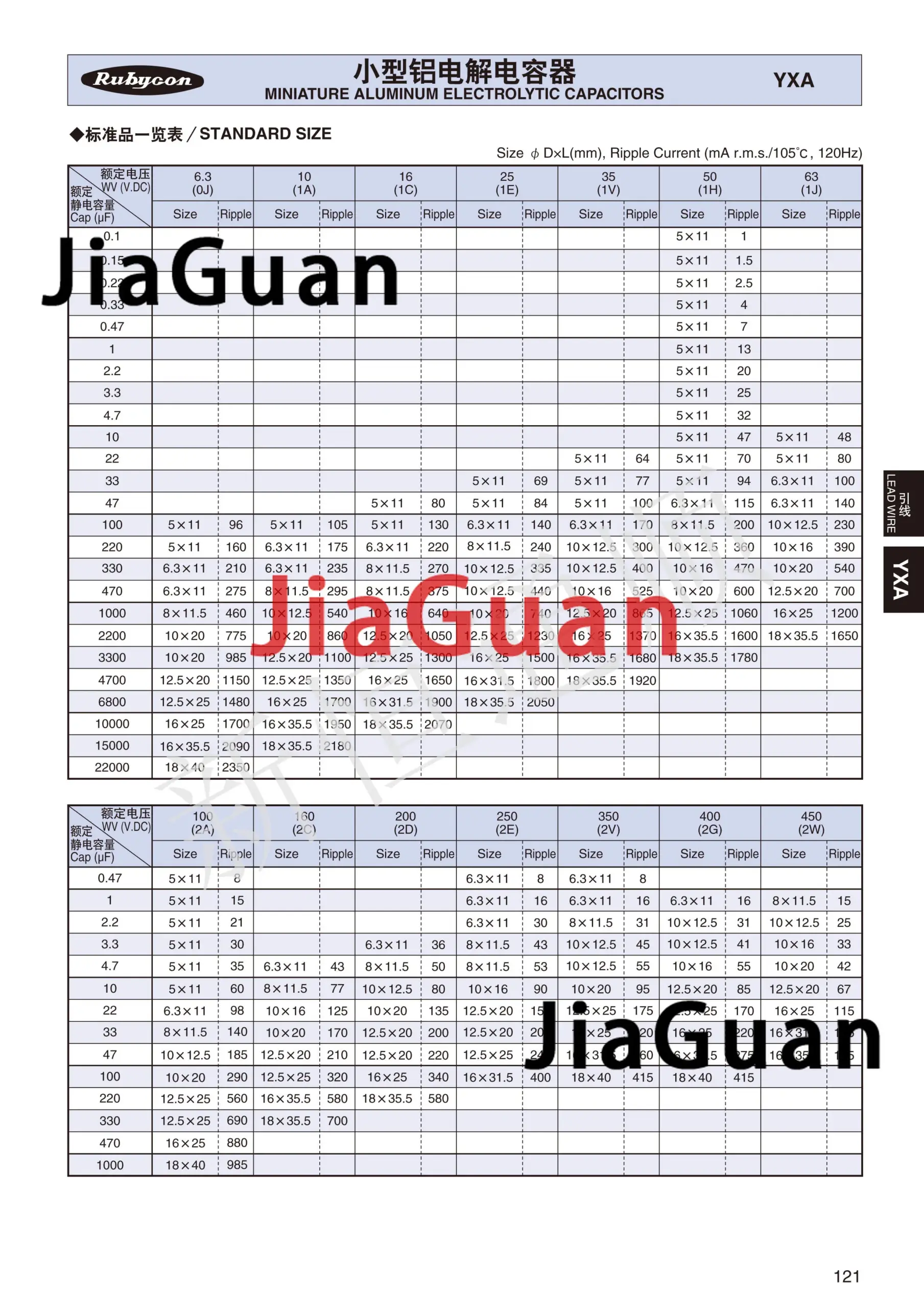 - The YXA series by Rubycon offers high-quality construction, with each component featuring a flat, recessed top marked by a white stripe to indicate the negative terminal for correct placement.