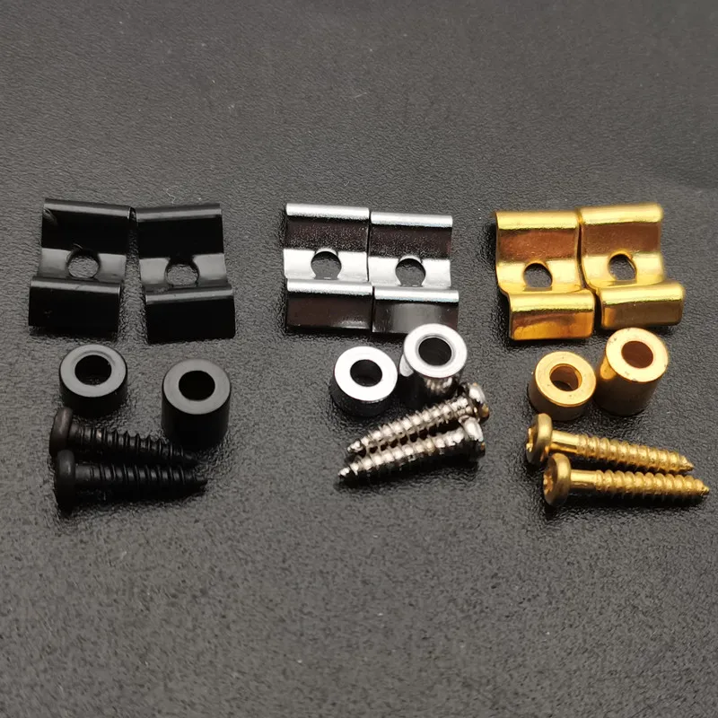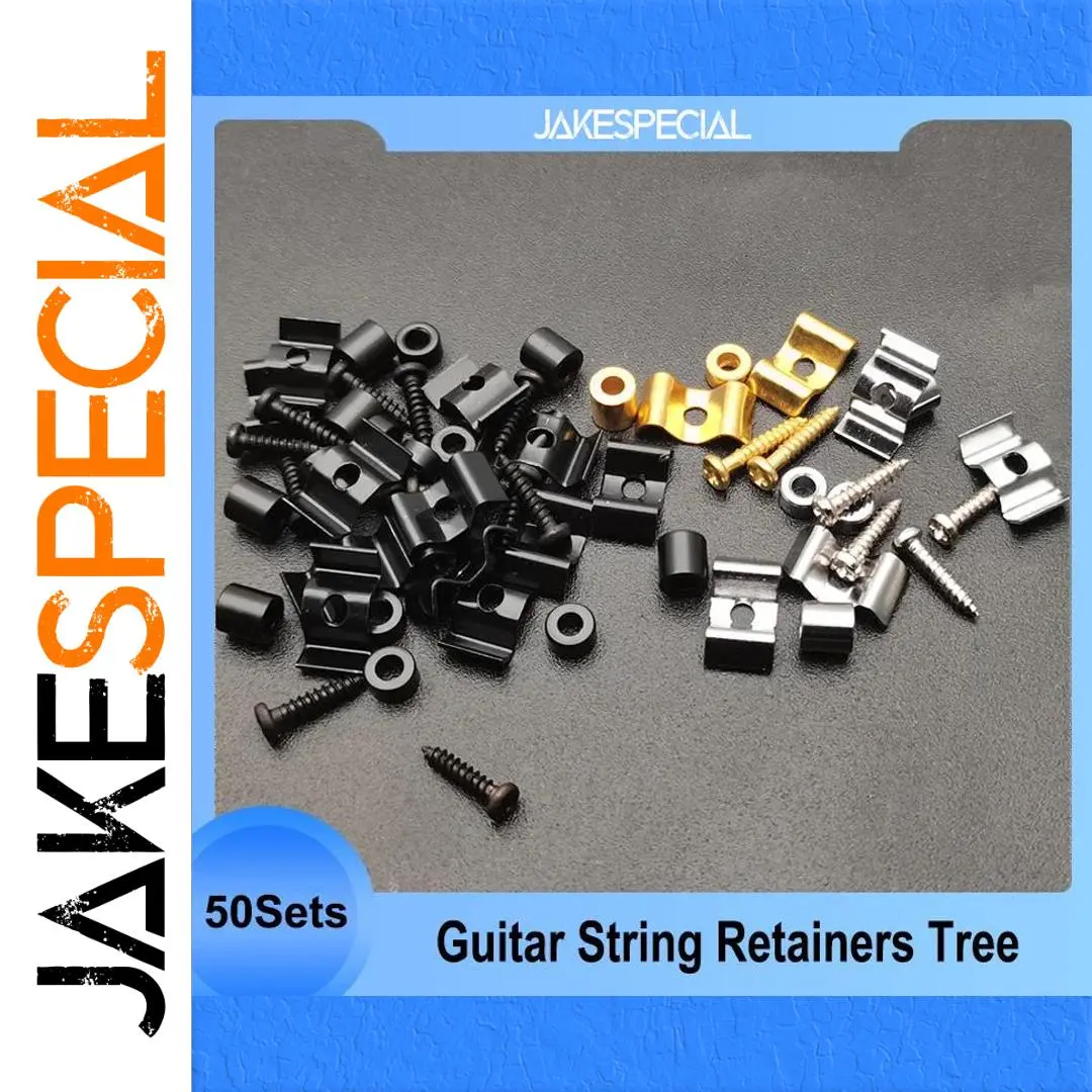 Enhance your electric guitar experience with this set of 50 electric guitar string retainers designed specifically for Stratocaster and Telecaster models. Available in three striking finishes—Black with a matte finish, Gold with a glossy sheen, and Chrome offering a polished metallic look—these high-quality metal retainers ensure durability and effective string retention. Each retainer features a small cylindrical design with a central hole for secure string passage, reducing friction for more accurate tuning. This comprehensive set also includes matching screws in the same finishes, providing a cohesive look for your beloved instrument. Model number MU0069.