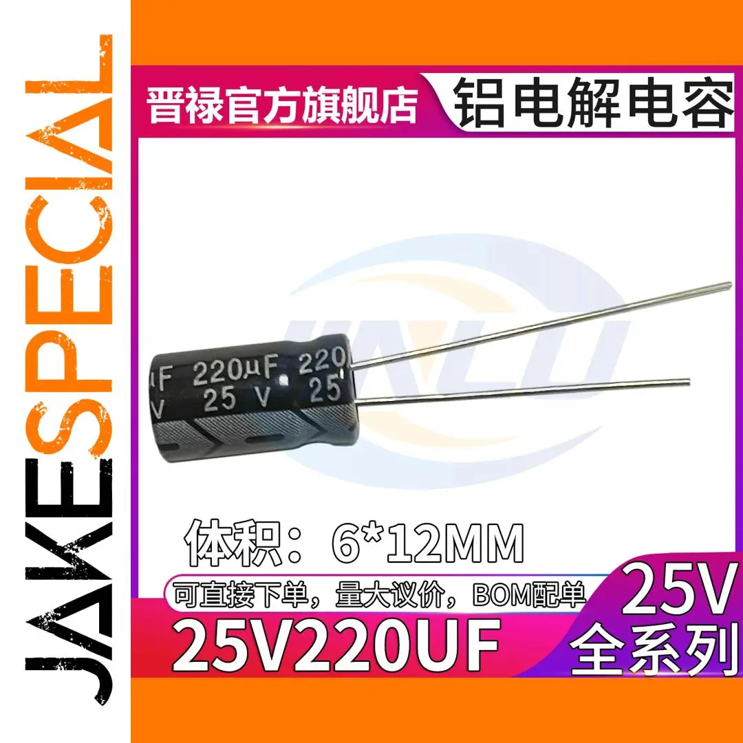 - Specifications include: 220μF capacitance, 25V voltage, 6mm diameter, 12mm length, fixed structure, aluminum electrolytic type, and black color for a modern aesthetic.