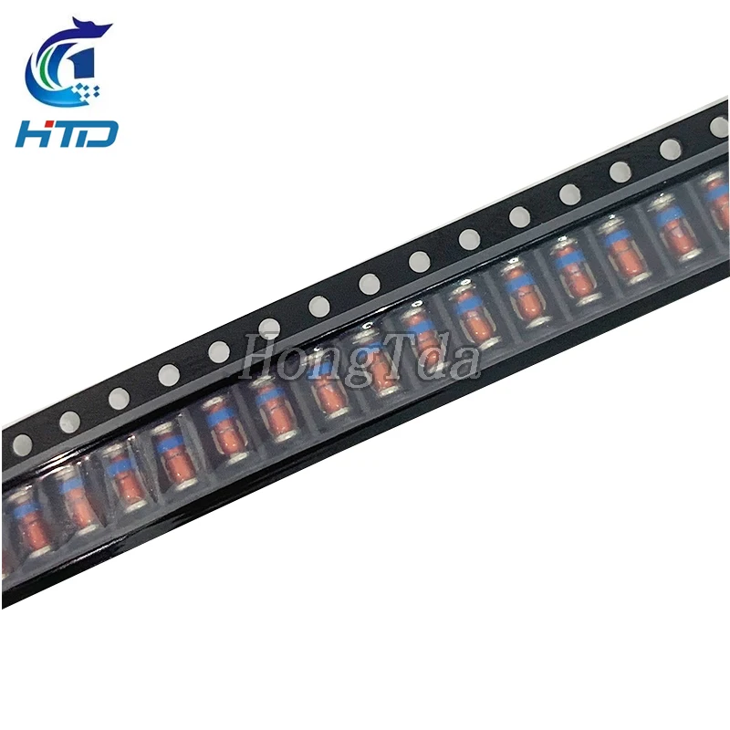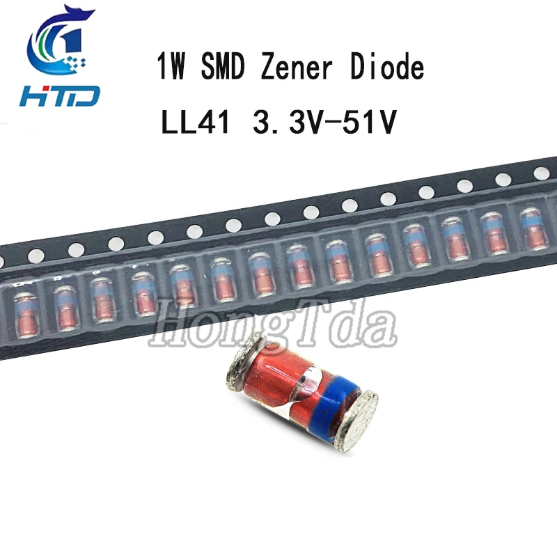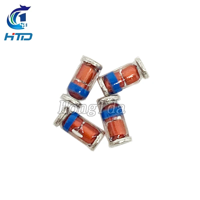 Load your circuits with this high-quality set of 50 surface-mount Zener diodes, featuring a variety of voltage options from 3.3V up to 51V. These compact, cylindrical diodes boast a glossy, transparent body that reveals internal components, accented by a striking red coloration and a vibrant blue ring near one end. A silver band marks the cathode side, ensuring easy identification. Designed for precision and reliability, these diodes are ideal for voltage regulation, signal clipping, and protection in advanced electronic projects. Their sleek, modern appearance complements high-tech circuit boards, making them perfect for professionals and enthusiasts who value both performance and aesthetic quality.