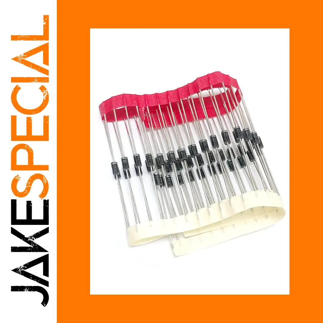 Experience reliable electrical performance with this set of 50 rectifier diodes, each precisely engineered to ensure optimal current flow and voltage handling. These diodes feature sleek, cylindrical black bodies with bright silver leads, providing a professional and clean appearance. Marked with a metallic band indicating polarity, they are arranged in an organized manner on a two-tone red and white plastic strip holder, making them easy to identify and handle. Designed for circuit installation, these diodes are suitable for various electronic repair or assembly projects. Their high-quality build guarantees durability, consistent performance, and compatibility with higher voltage systems, making them invaluable for power rectification, voltage regulation, and other high-demand applications.