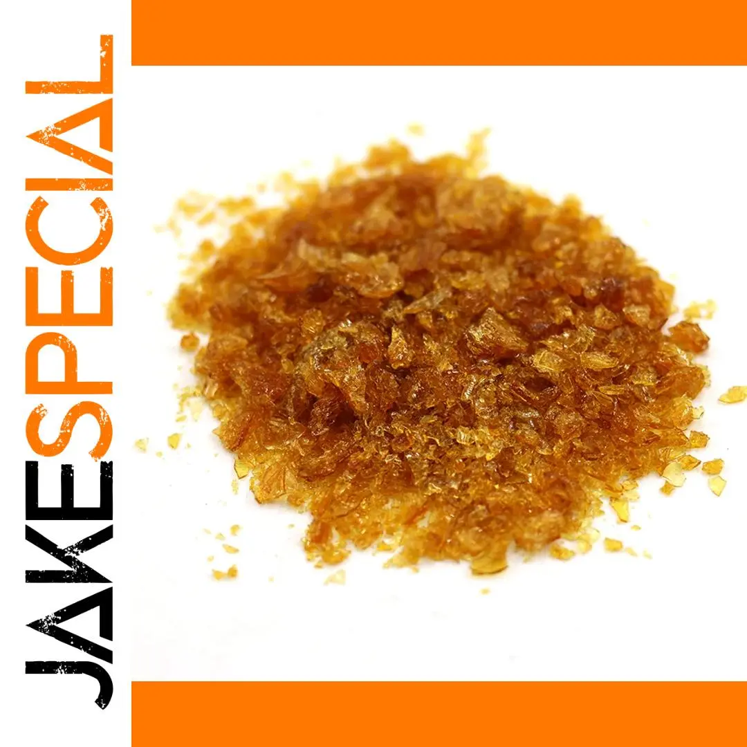 - High-quality 50g pack of irregularly shaped shellac flakes with crystalline texture and warm amber-brown color, ideal for guitar finishing and professional coatings.