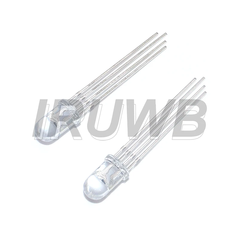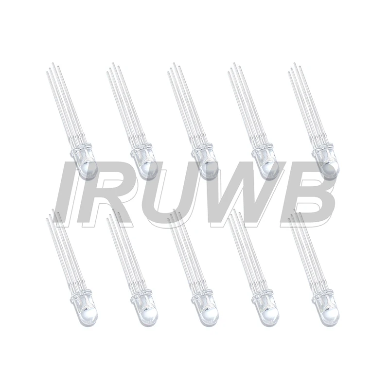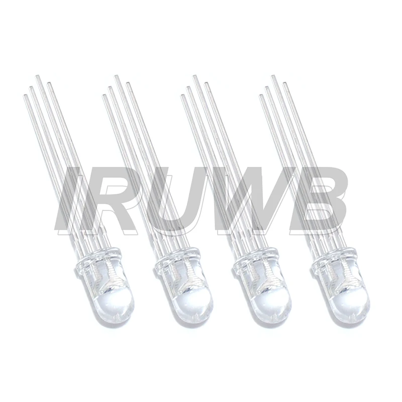 Experience vibrant, full-color illumination with this set of 50 high-quality, 5mm RGB LEDs. Designed with a sleek transparent four-foot body, these LEDs showcase internal components through clear, dome-shaped tops, emphasizing their modern and technical aesthetic. Whether you choose the common cathode or anode configuration, these LEDs are perfect for intricate lighting projects, decorative displays, or custom electronic circuits. Operating at a recommended voltage of 3.3V with a maximum of 5V, each LED delivers bright, stable illumination with good self-healing performance and durability. The diffused or transparent finish options allow versatile light dispersion, suitable for creating dynamic color effects with smooth RGB blending.