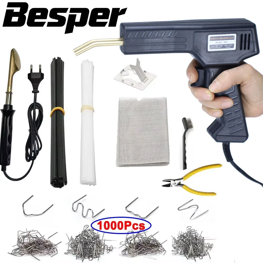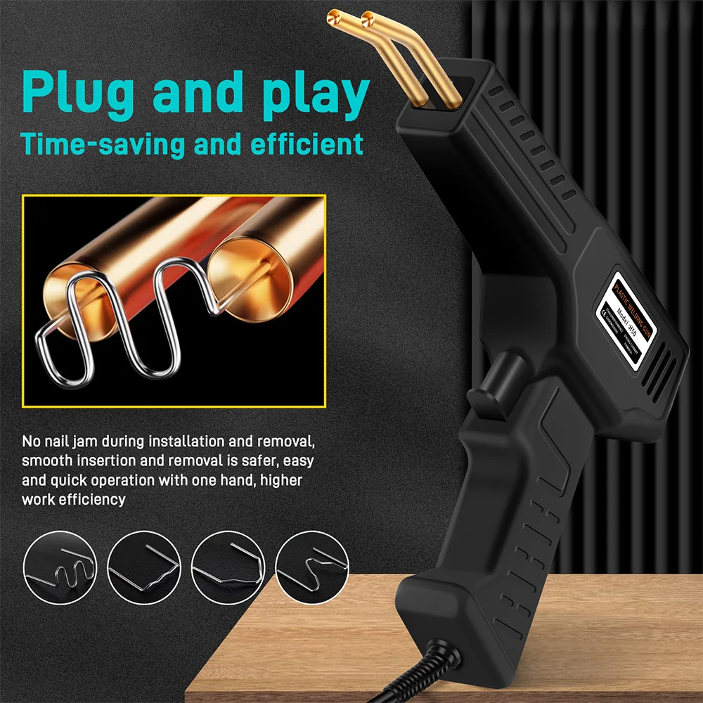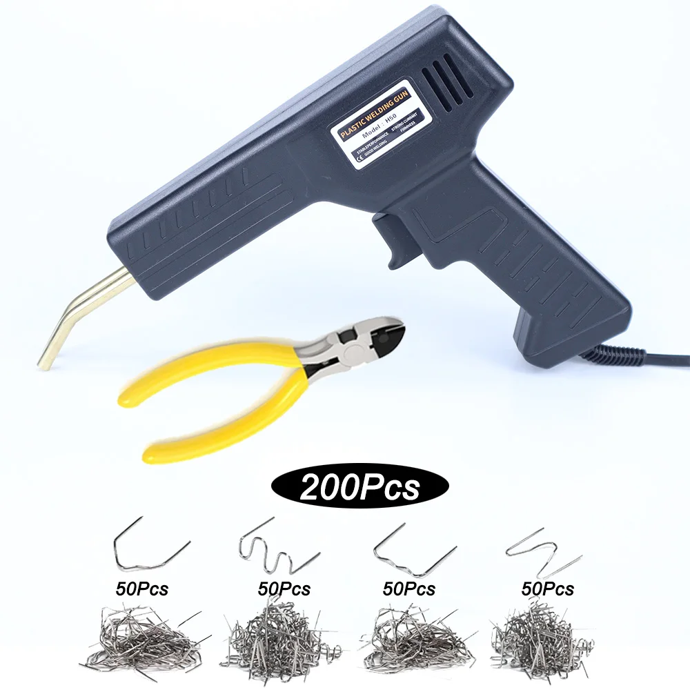 This 50W plastic welder and hot stapler features a sleek black ergonomic design with a shiny gold-colored welding tip, ensuring comfortable handling for precise repairs. Powered by 220V EU voltage, it offers adjustable output between 0-50V and 0-15A, with durable stainless steel staples designed with a rust-resistant, wavy pattern for maximum load capacity. Suitable for quick, strong bonding of plastic parts such as automotive bumpers, dashboards, and lamp holders, it includes overheat protection to prevent damage during continuous use of up to 15 minutes, followed by a recommended 30-minute rest. Perfect for DIY plastic repair enthusiasts seeking professional-grade results.