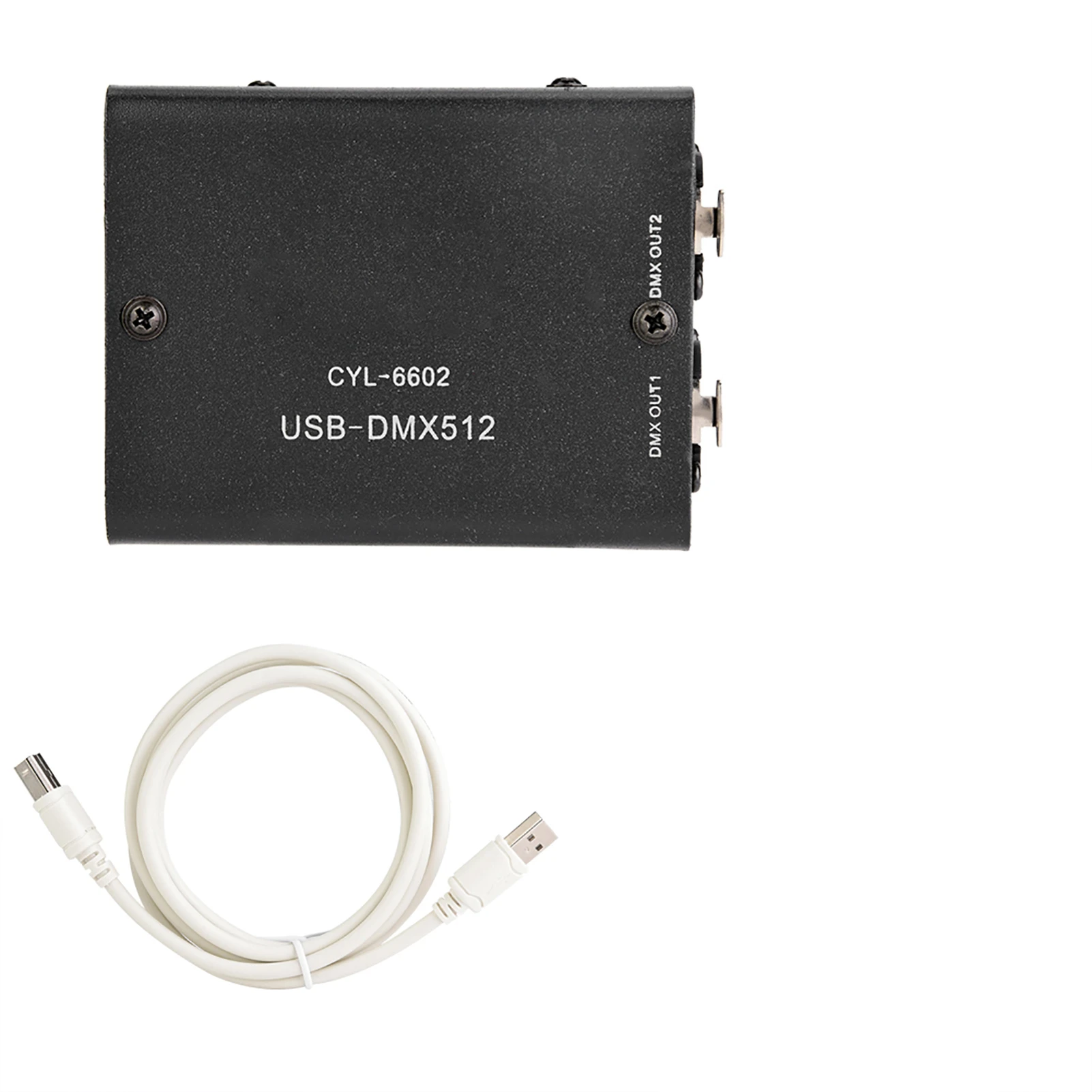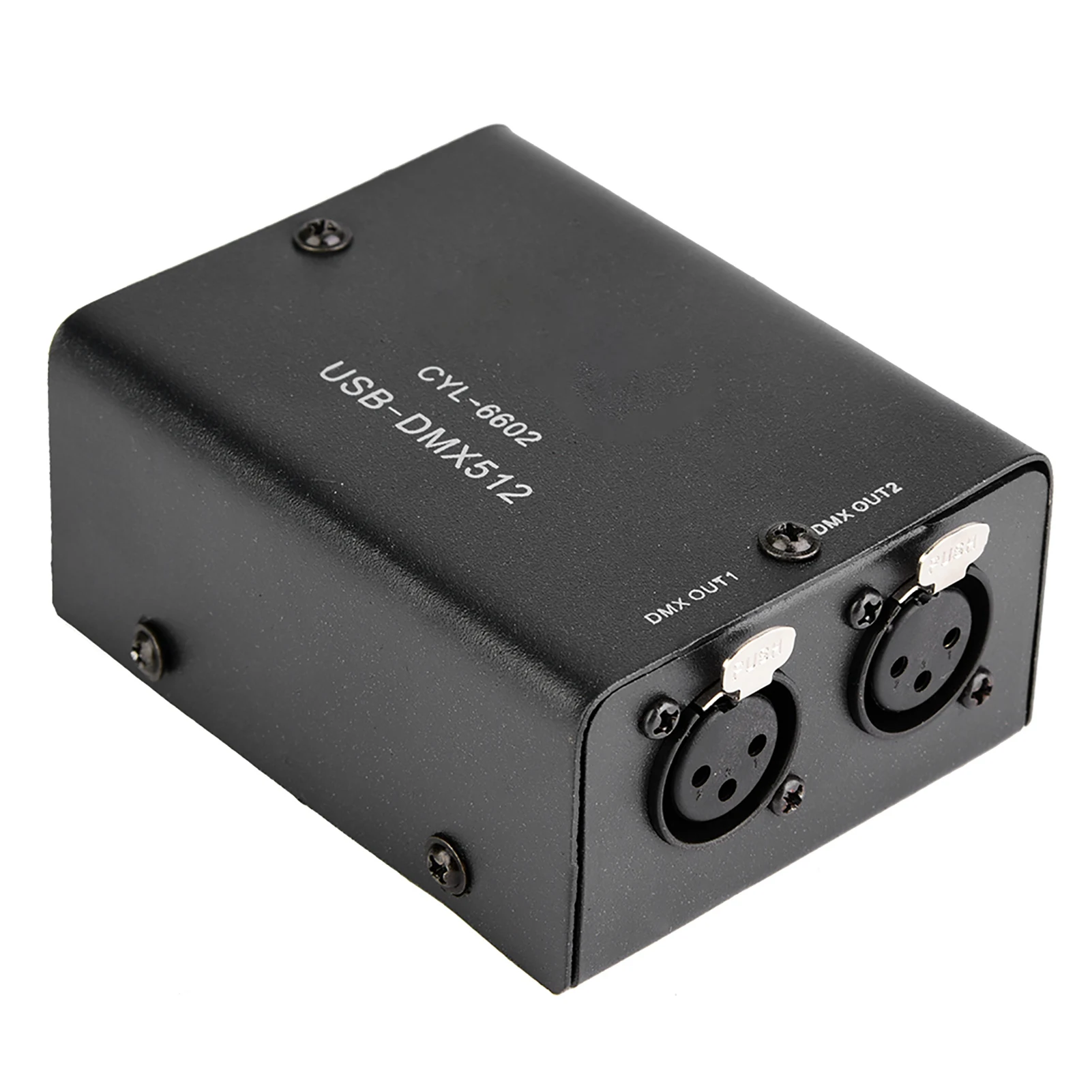 This compact black 512-channel USB to DMX512 stage lighting controller measures approximately 90mm x 70mm x 42mm and features a sleek matte finish. Designed for professional lighting setups, it offers DMX-512 input and output with 512 channels each, buffers DMX data, and connects via a USB cable for seamless control. Compatible with Windows operating systems from Win98SE to Win7 (32/64-bit), it allows control of a wide range of stage lighting equipment such as scanning lights, moving headlights, laser lights, LED lights, fog machines, color changers, and dimmers. Certified with CE, it requires driver installation and supports advanced software features for complex lighting shows.
