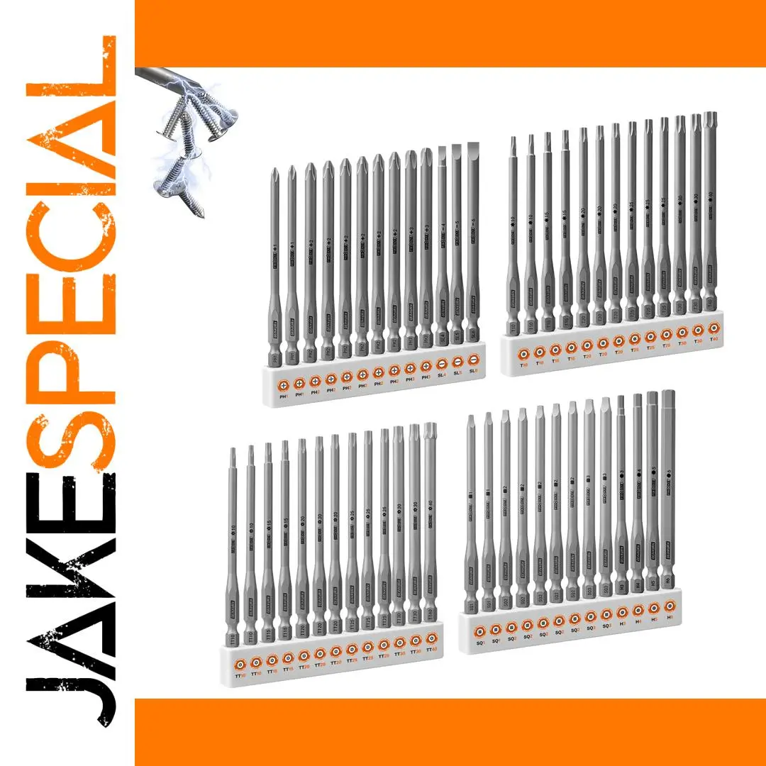 - Variety of bits including Phillips, Slotted, Square, Hex, Torx, and Tamper Torx types, with sizes listed (e.g., PH1×2, T20×3), suitable for a wide range of household and electronics repairs.