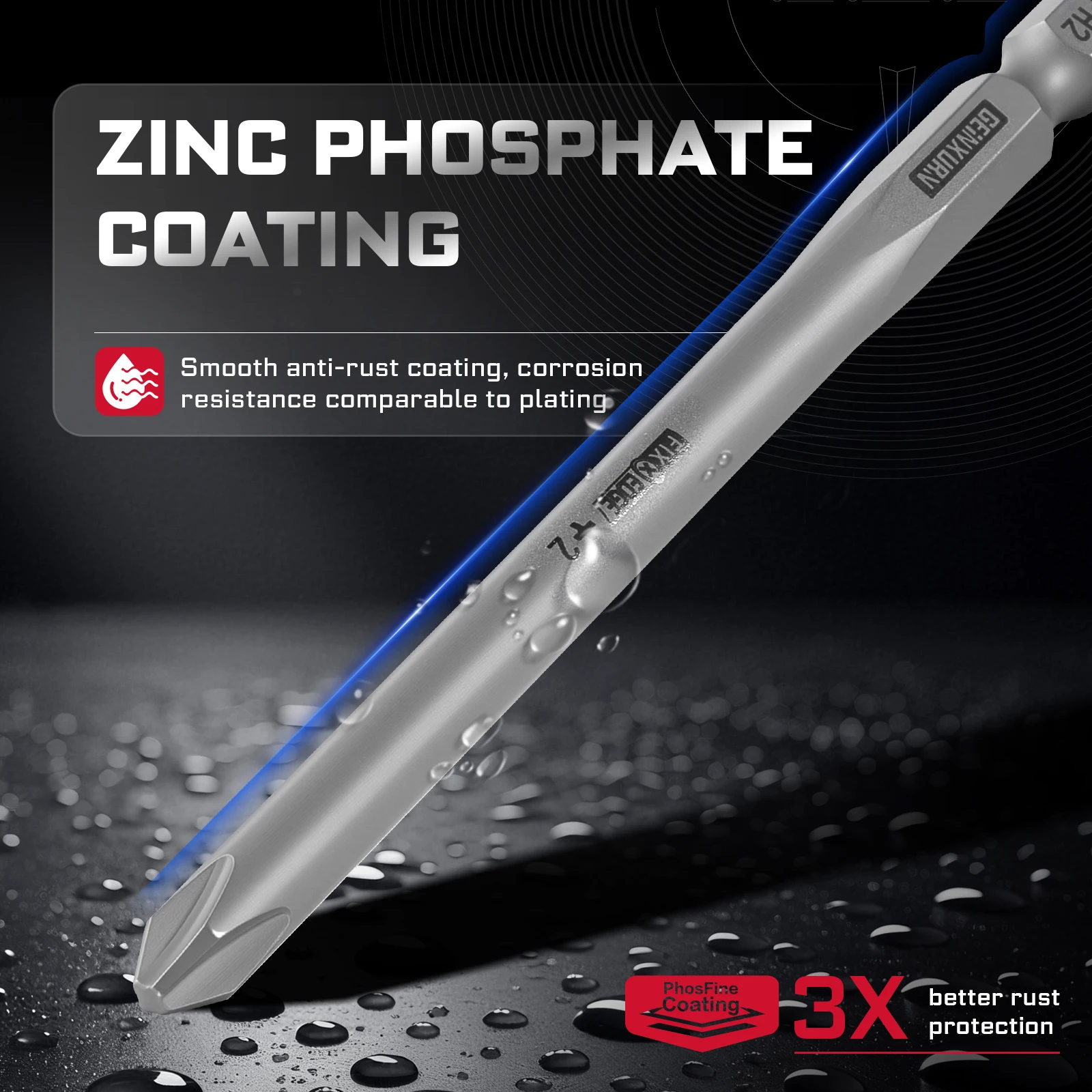 - Technical specifications include: 4-inch alloy steel bits, magnetized tips, zinc phosphate coating for corrosion resistance, and sizes ranging from small Phillips PH1 to larger Tamper Torx TT40 for versatile use.