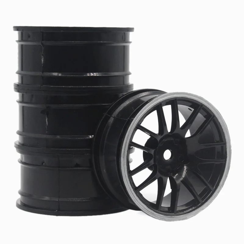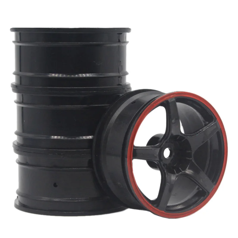 Imagine enhancing your RC drift car with this sleek set of four plastic wheel rims. Designed specifically for 1/10 scale models, these rims feature a contemporary look with a glossy black finish accented by a vivid red ring around the edge. The detailed spoke pattern radiates from the center hub, promoting an aerodynamic and lightweight profile perfect for racing. Whether you're upgrading your vehicle’s aesthetics or seeking a durable replacement, these rims promise both style and functionality. Their construction from high-quality plastic ensures longevity and performance under racing conditions. Perfect for enthusiasts wanting to customize their RC cars, these rims will elevate your vehicle's appearance and on-track performance seamlessly.