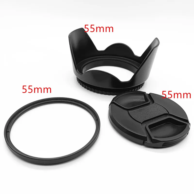 - The technical specifications include a 55mm diameter for the UV filter, a flower-shaped hood and a snap-on lens cap, all optimized for professional and enthusiast use.