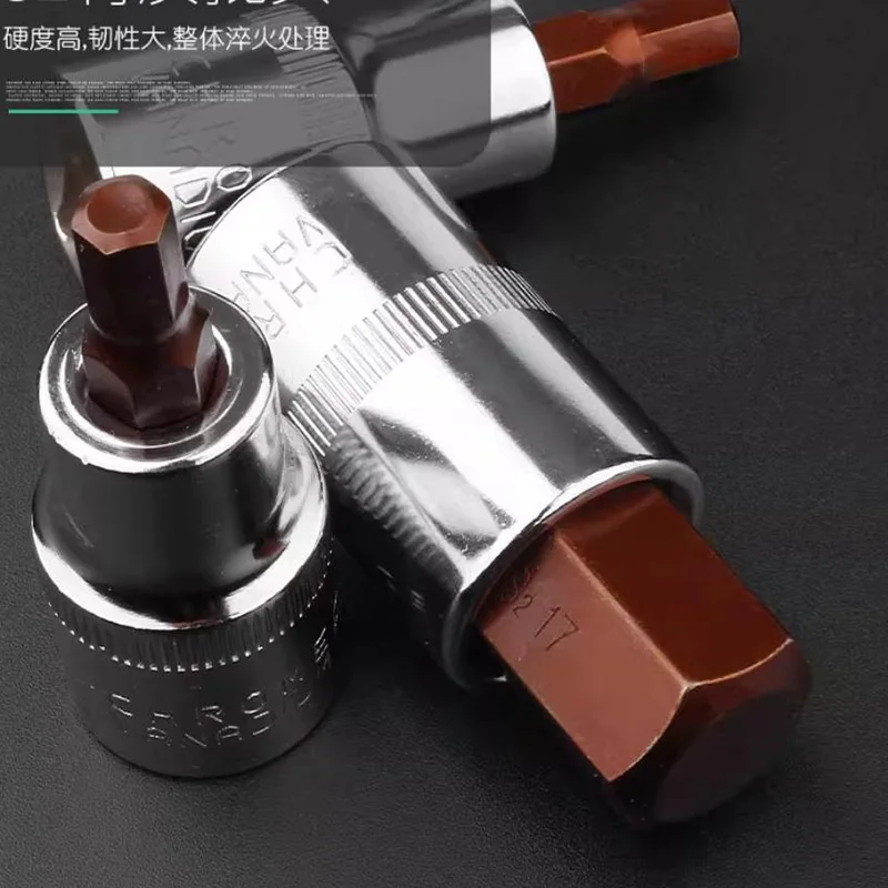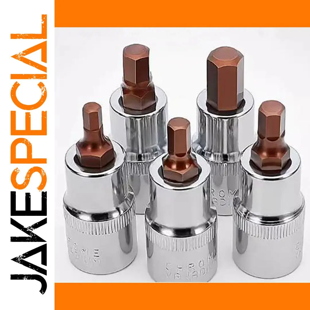 This high-quality 55mm long hex socket set features a 1/2 inch drive and includes sizes H3, H4, H5, H6, H7, H8, H10, H12, H14, H17, and H19, crafted from durable chromium-vanadium steel and S2 material for precise hand working applications. The polished, reflective finish with engraved markings ensures easy identification, while the hex heads with bronze-colored coating offer a striking visual contrast and secure grip. The set is ideal for professional automotive, mechanical, or maintenance tasks, providing reliable performance and durability. Designed with a clean, minimalistic style and ridged grip bands, this set promises an efficient, high-quality tool for serious enthusiasts and mechanics.