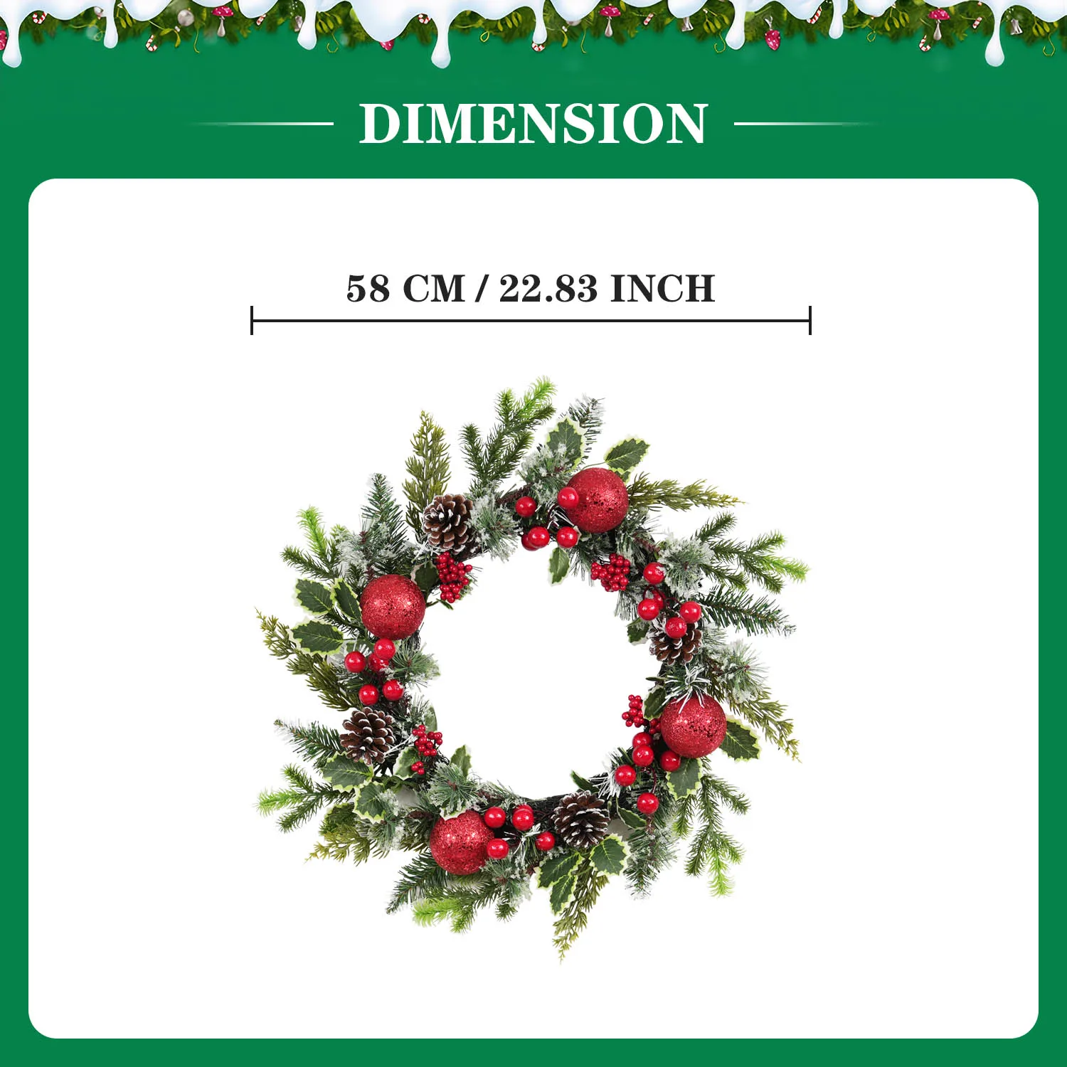 Imagine welcoming your guests with this beautifully crafted 58cm Christmas wreath, perfect for decorating your front door, window, or wall during the festive season. Made from natural straw, it offers a rustic, textured look that radiates warmth and charm. Adorned with vibrant red glittery balls, glossy red berries, pinecones dusted with white to resemble snow, and sprigs of evergreen foliage with distinctive white-edged holly leaves, the wreath combines natural elegance with cheerful sparkle. Its durable design makes it suitable for outdoor display, instantly creating a lively holiday atmosphere. This timeless decoration will become a treasured part of your annual festivities, elevating your seasonal décor with natural beauty and festive spirit.