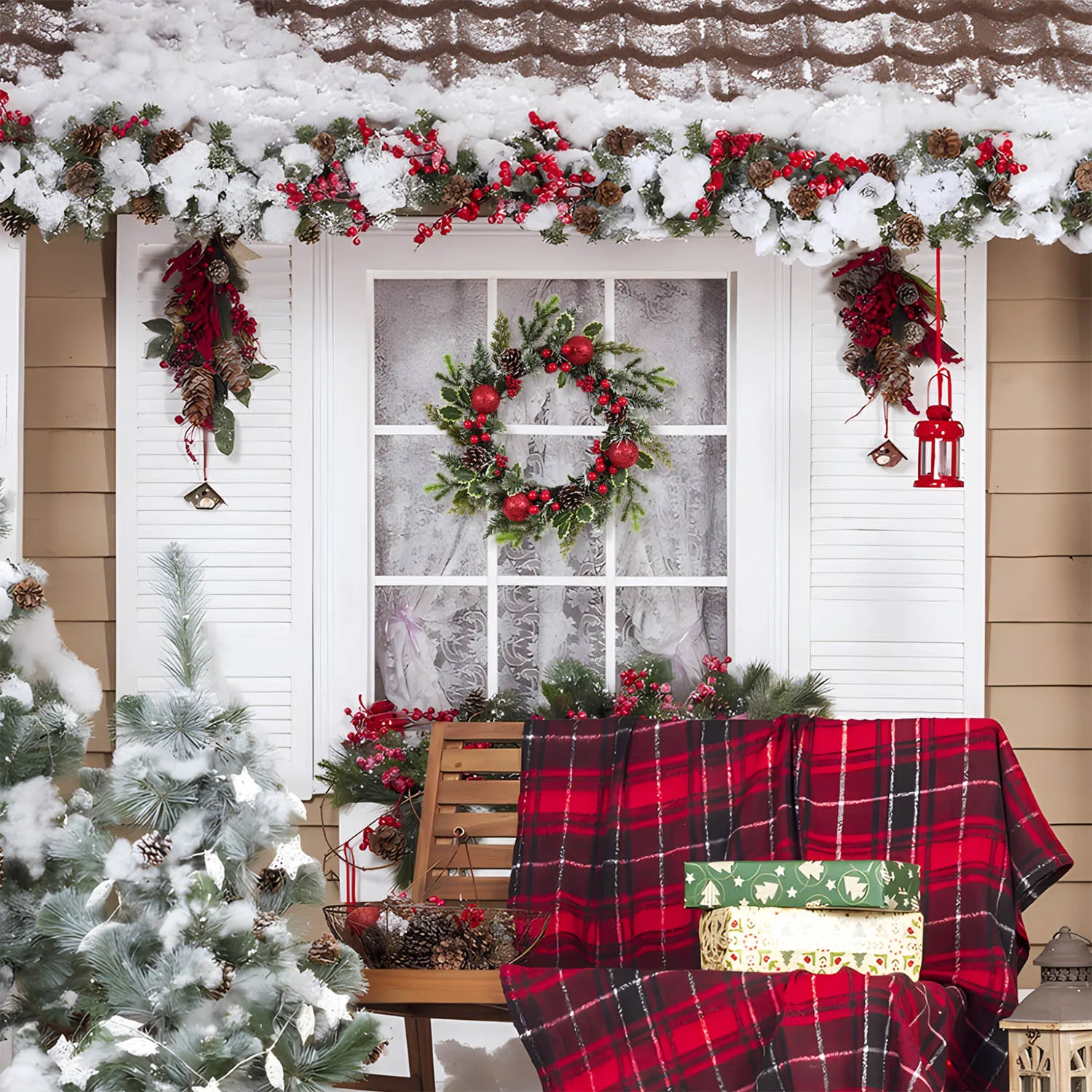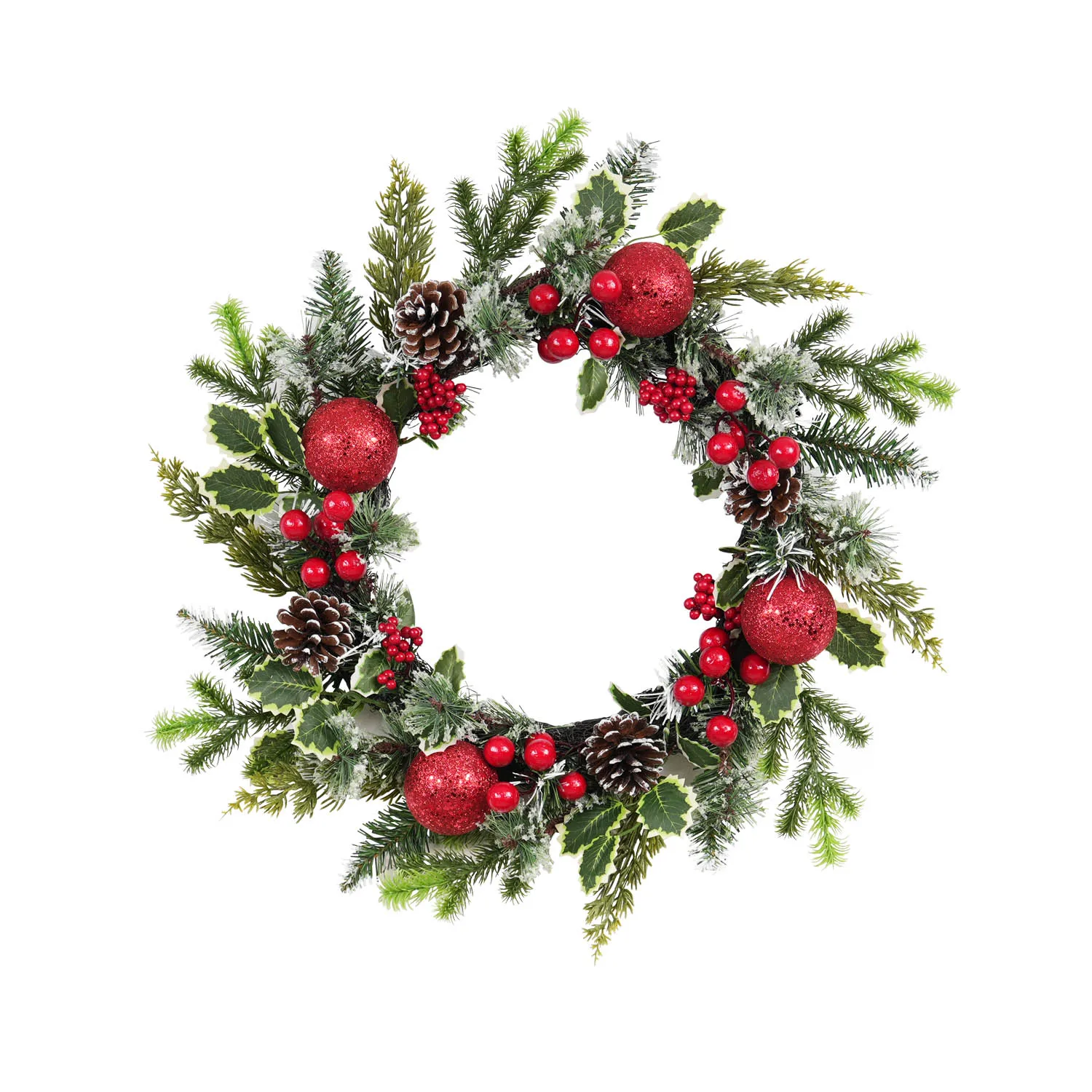 - Decorated with bright red glittery balls, glossy red berries, and interwoven pinecones dusted with white to resemble snow, creating vibrant seasonal accents that sparkle and catch the eye.