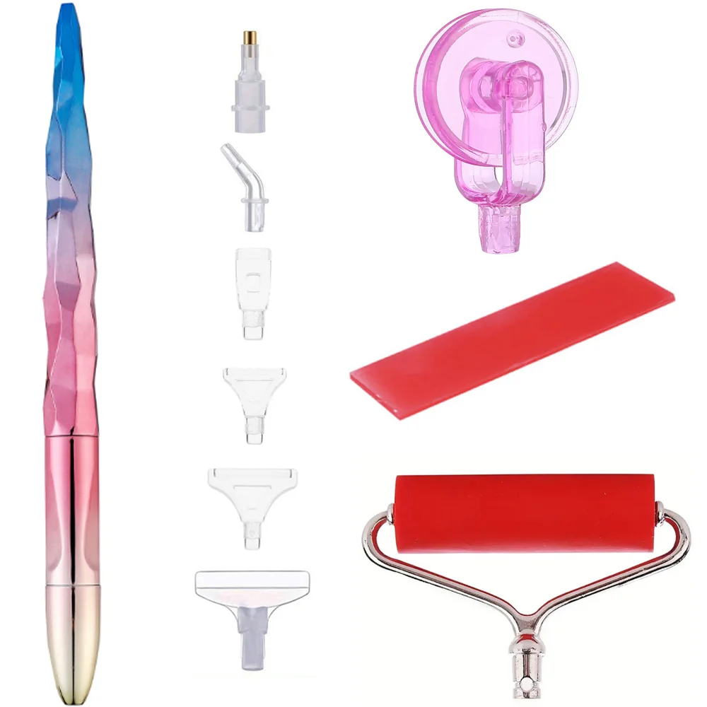 Step into the world of creativity with this vibrant 5D diamond painting pen set, designed to elevate your artistic experience. Crafted with eye-catching gemstone-like aesthetics, each pen features a polished, reflective surface and a tapered, elongated shape for comfortable handling. Available in playful color schemes like purple, pink, pink blue, and pink green, these pens add a touch of elegance and fun to your craft sessions. The set includes six drill heads of different shapes, a textured roller, and a flexible roller glue tape, making your diamond placement smooth and precise. Whether you're a beginner or an experienced artisan, this set transforms your diamond painting process into a delightful, professional-quality craft.