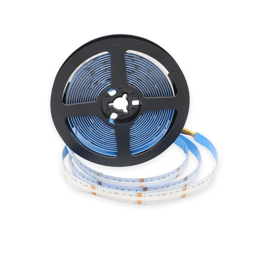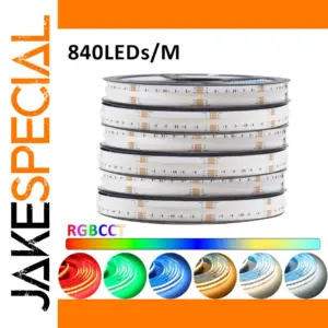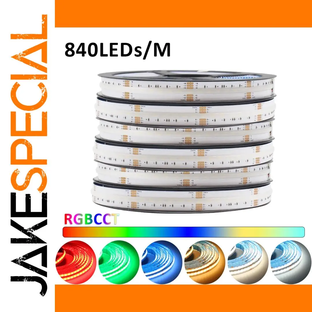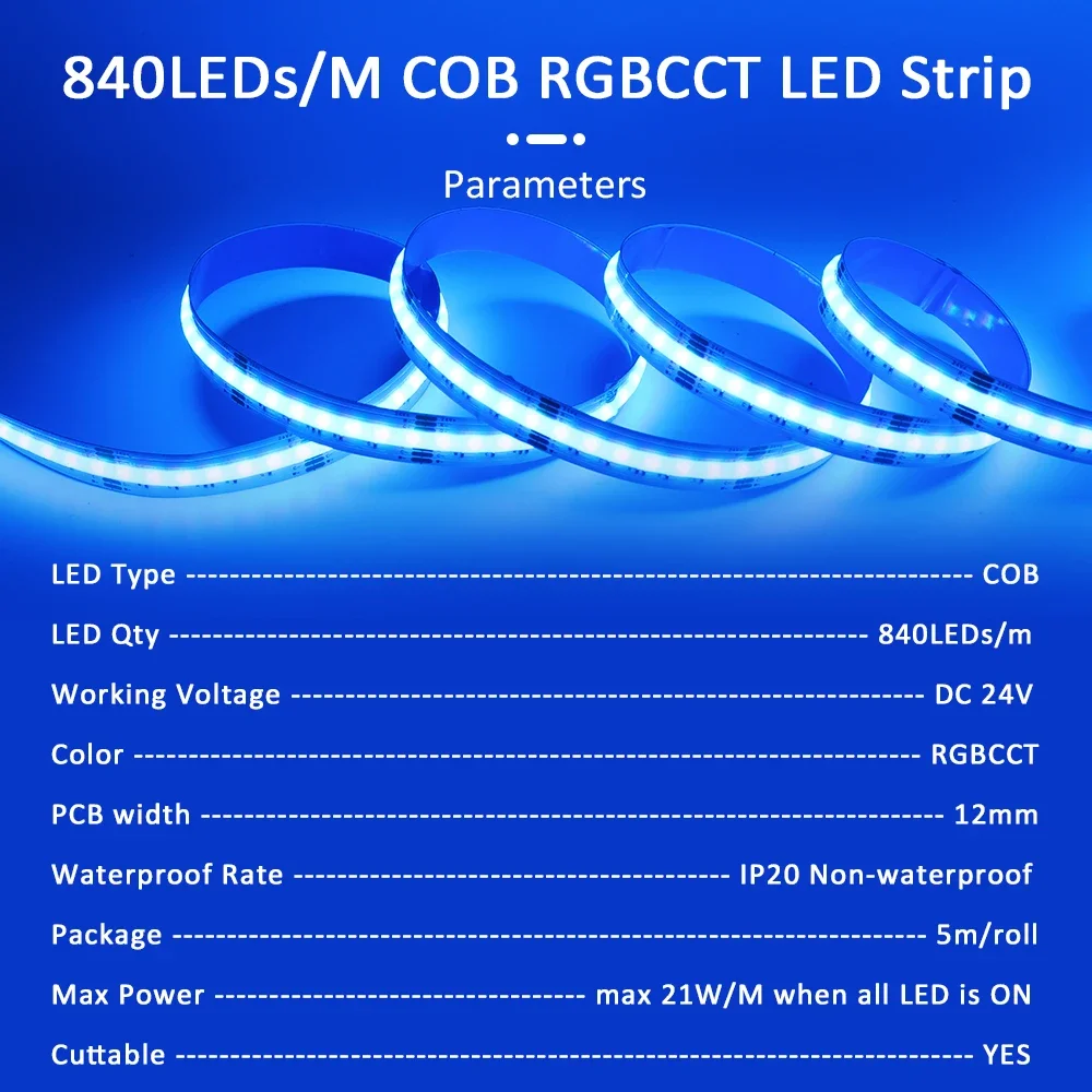 Experience vibrant, customizable lighting with this 5-meter COB RGBCCT LED strip, operating at 24V DC and consuming up to 21W per meter. The slim 12mm wide strip features 840 densely packed LEDs per meter, capable of producing RGB, warm white (2700K), and cool white (6500K) light with a high color rendering index (Ra > 90) and a 180° viewing angle. Designed for indoor use (IP20), it offers a lifetime of approximately 50,000 hours at temperatures below 70°C. This flexible, cuttable strip includes 6-pin connectors and requires compatible RGBCCT controller and power supply to create dynamic, stylish lighting effects in your space.
