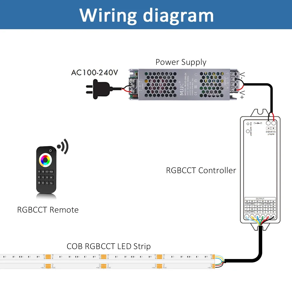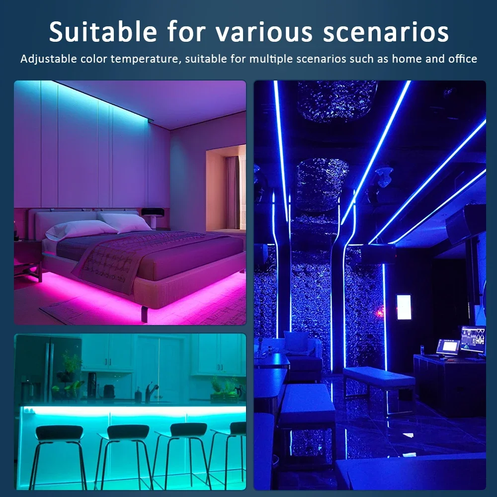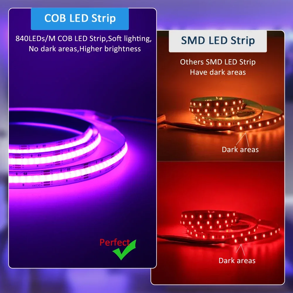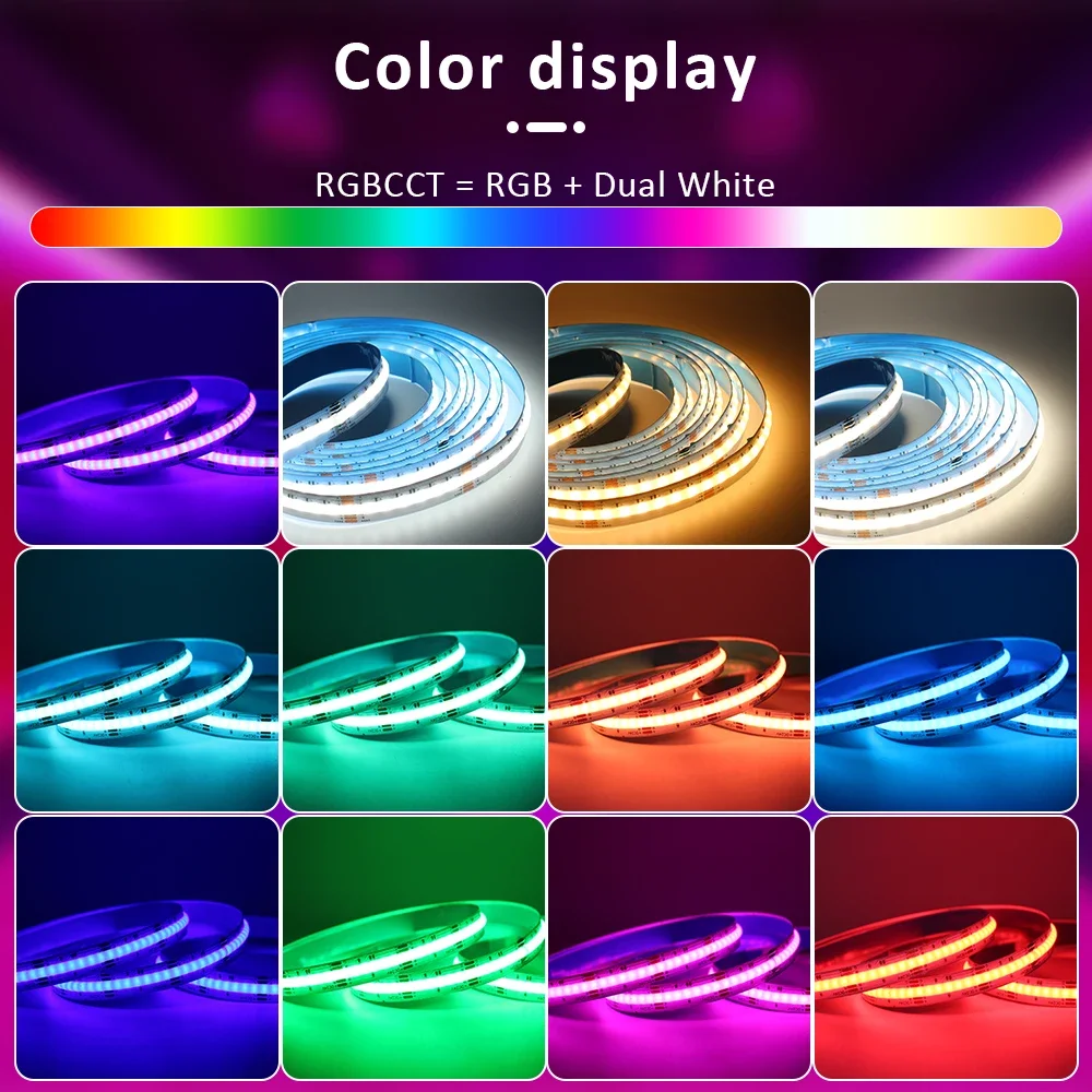Experience vibrant, customizable lighting with this 5-meter COB RGBCCT LED strip, operating at 24V DC and consuming up to 21W per meter. The slim 12mm wide strip features 840 densely packed LEDs per meter, capable of producing RGB, warm white (2700K), and cool white (6500K) light with a high color rendering index (Ra > 90) and a 180° viewing angle. Designed for indoor use (IP20), it offers a lifetime of approximately 50,000 hours at temperatures below 70°C. This flexible, cuttable strip includes 6-pin connectors and requires compatible RGBCCT controller and power supply to create dynamic, stylish lighting effects in your space.