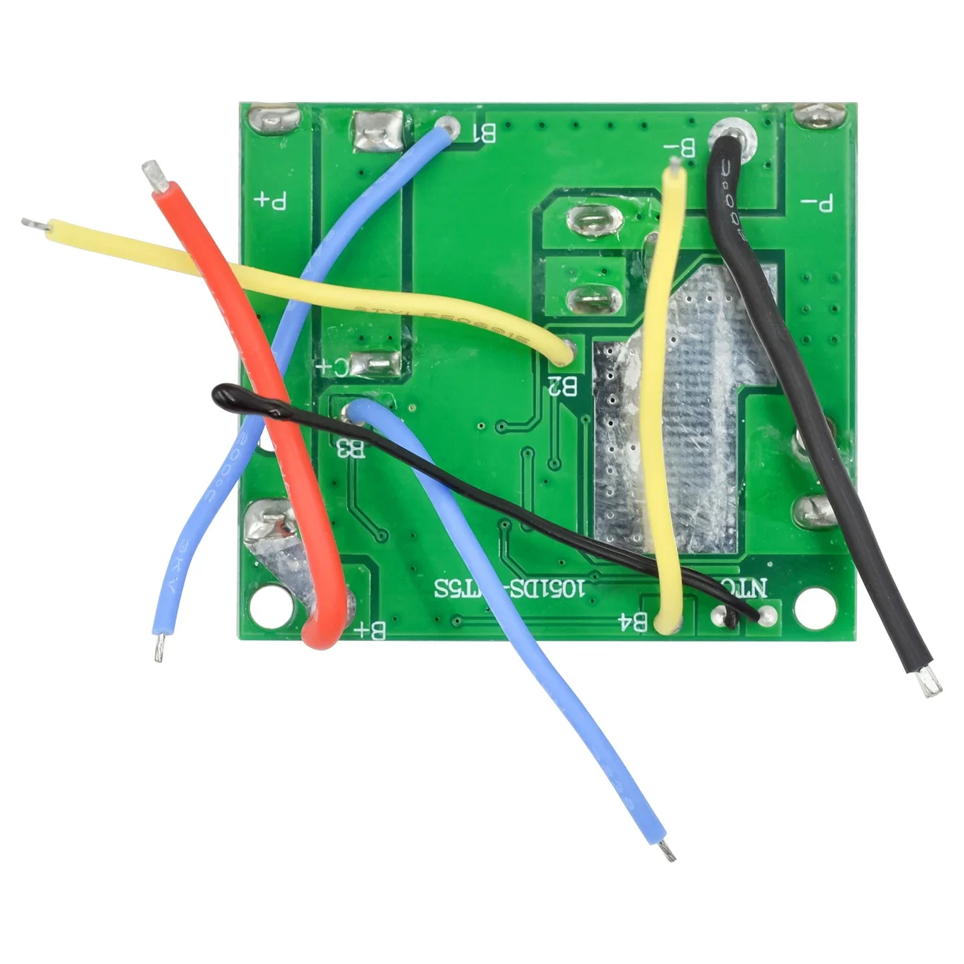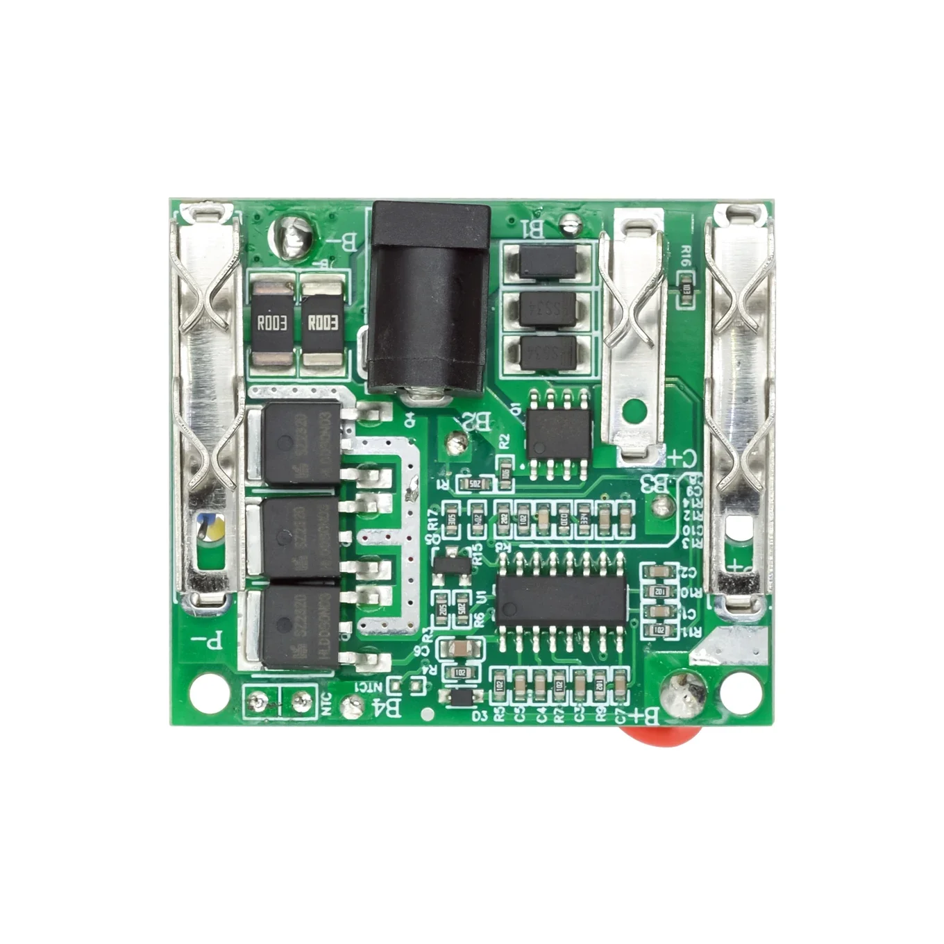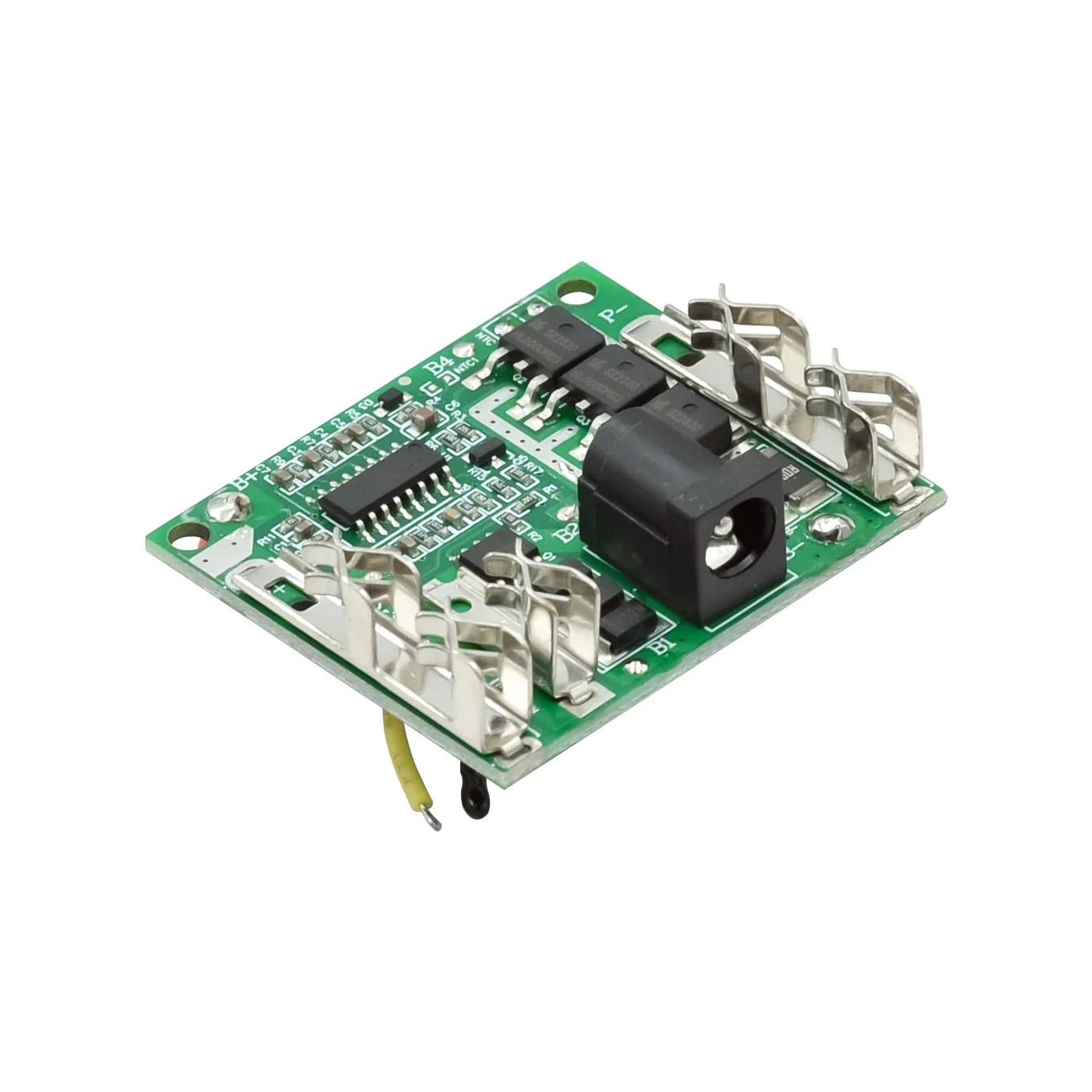 This is this high-quality 5-series lithium battery protection board, designed to enhance safety and longevity for your power tools and battery packs. With a vibrant green PCB surface, it combines a sleek, modern aesthetic with practical functionality. The black integrated circuits, neatly aligned surface-mount resistors, and capacitors showcase precision engineering, while the silver heat sinks and connectors add durability and efficient heat dissipation. Its compact size, approximately 46mm by 40mm with a height of 3.6mm, makes it ideal for various applications. The waterproof, moisture-proof, and electric insulation design ensures reliable operation even in rugged outdoor environments. Perfect for maintaining the safety and performance of lithium-ion, lithium manganese, lithium cobalt, or ternary batteries in 21V power tools and hand drills, this protection board is indispensable for enthusiasts and professionals alike.