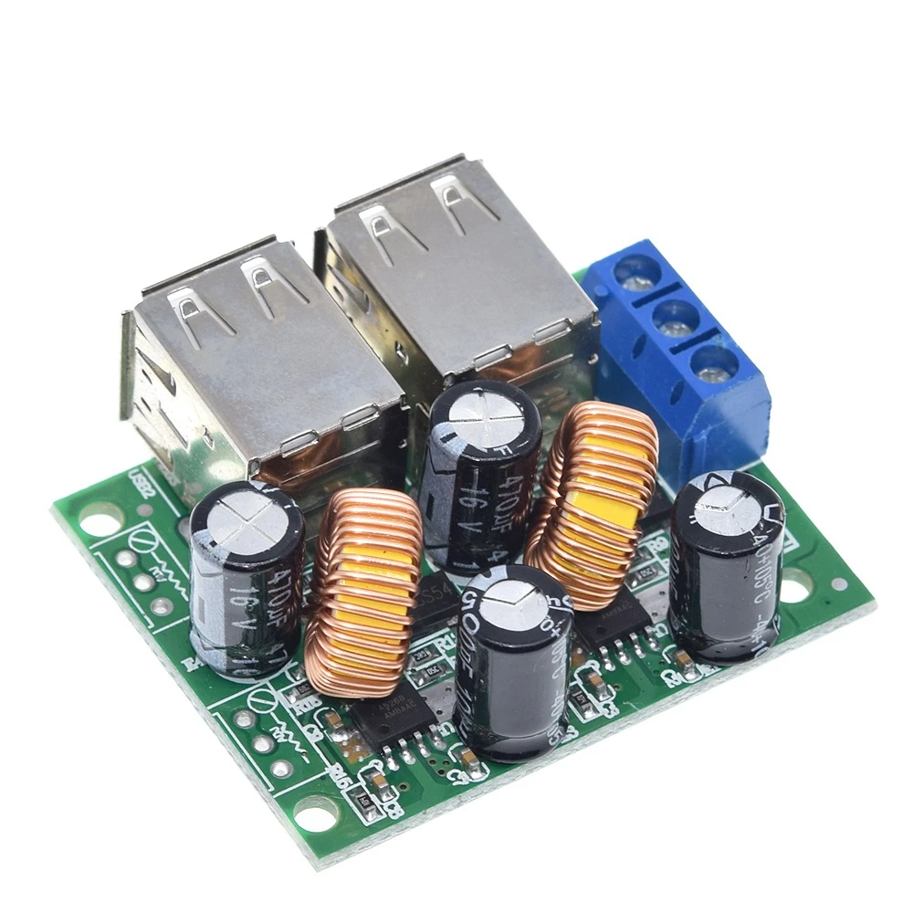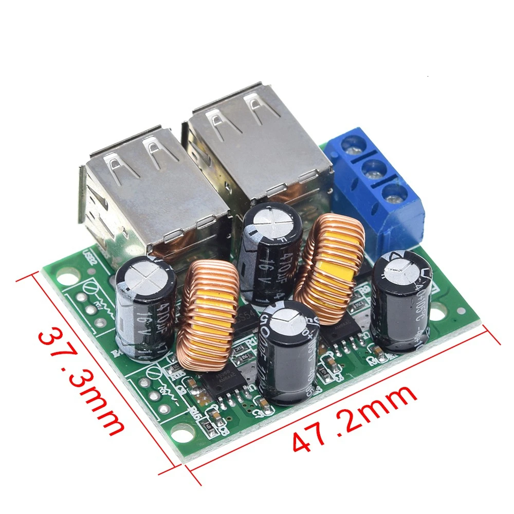 This compact DC step-down power supply converter module measures 37mm x 47mm x 18mm and features a durable green PCB with white silkscreen markings. Powered by the A5268 chip, it delivers a stable 5V output at up to 5A, supporting devices like MP3/MP4 players, smartphones, tablets, navigation systems, vehicle dashcams, and Bluetooth devices, all within 25W. Equipped with two brass USB sockets, a blue input terminal block, black electrolytic capacitors, and yellowish copper inductors, the module offers high efficiency exceeding 94% through synchronous rectification. Designed for automotive and electrical applications, it operates over an input range of 9V to 40V, ensuring safety and reliability in demanding environments.