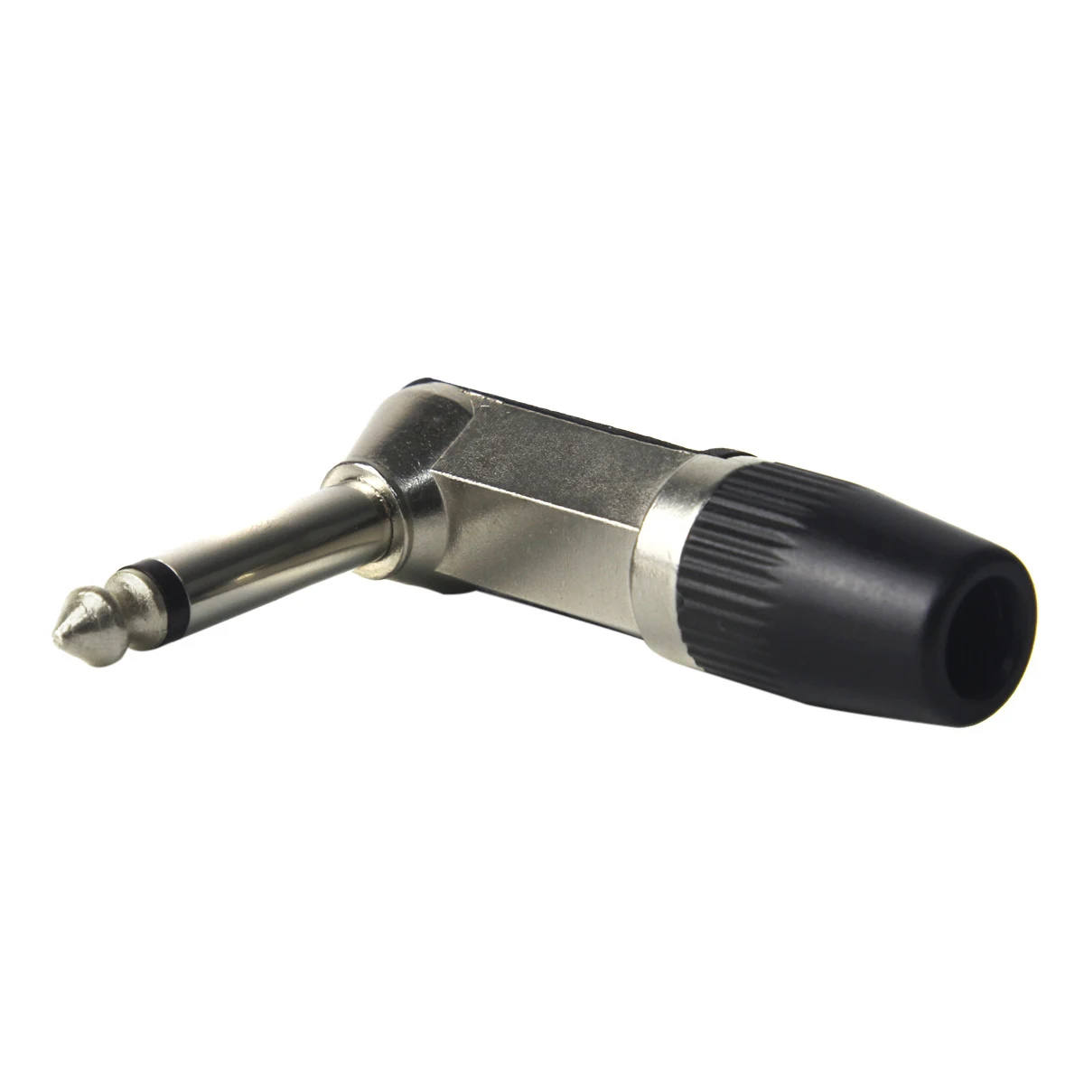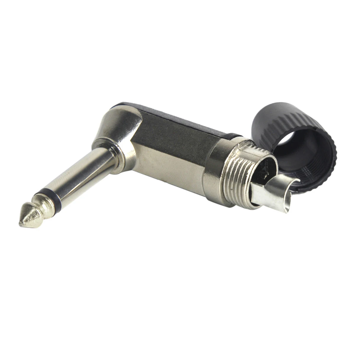 Experience reliable performance and sleek aesthetics with this this 6.35mm mono jack plug. Designed with a right-angle configuration, it offers a compact and space-saving solution for your guitar, amplifier, or audio setup. The black plastic body provides a textured grip for easy handling, while the shiny metal tip delivers excellent conductivity and durability. Its rugged construction ensures it withstands demanding live performances and studio environments. Perfect for custom cable building or replacing worn-out jacks, this plug combines industrial elegance with practical strength. Its ergonomic design minimizes cable stress, providing a professional, long-lasting connection for high-quality audio signal transmission. Trust this this mono jack to deliver clear, stable sound in any setting.