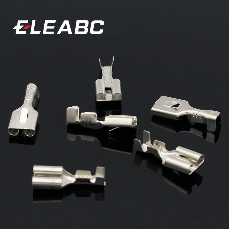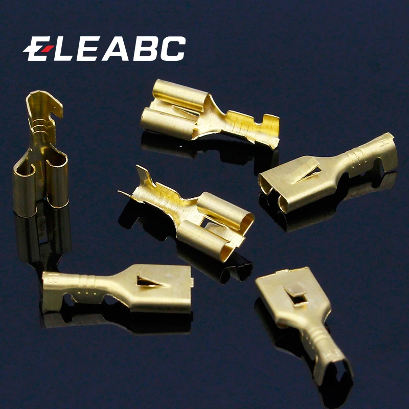 Experience reliable and high-quality electrical connections with this this 6.3mm female crimp terminal connector from ELEABC. Crafted with precision, it features a polished, gold-colored metallic finish that ensures excellent conductivity and durability. Its compact, functional design includes a flat crimping section that securely holds wires and a curved, U-shaped spade terminal for easy attachment in automotive and electrical systems. The connector’s uniform size and professional appearance make it ideal for applications that demand both efficiency and aesthetic finesse. Whether you're assembling a new wiring setup or repairing an existing system, this connector provides a seamless connection, ensuring safety and longevity in your electrical projects.
