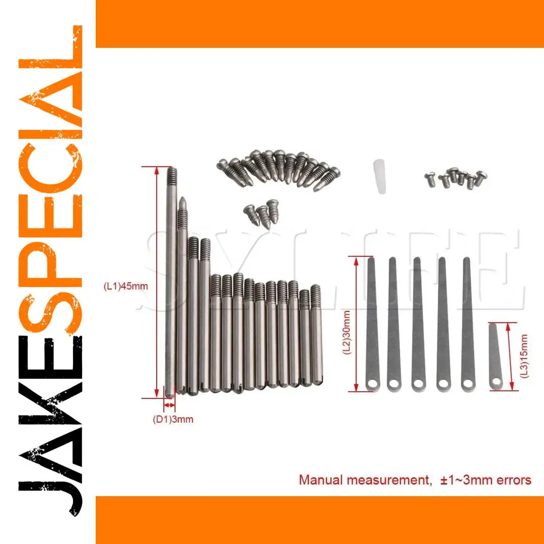 - Contains 11 flat top screws that measure about 30mm in length, shaped with smooth edges and drilled holes to facilitate adjustments.