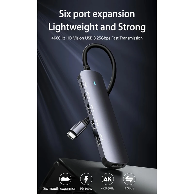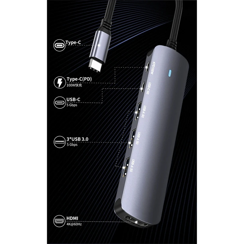 - Technical specifications include a total of 6 expansion interfaces: 1 x 4K 60Hz Type-C video output, 1 x USB-C 5G port, 3 x USB-A 5G ports, and a PD 3.0 port supporting 100W power delivery, compatible with a broad range of notebooks and devices.
