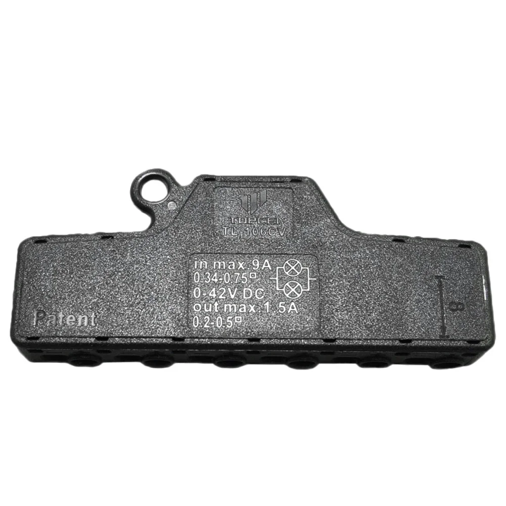 Transform your low-voltage LED lighting setups with this sleek black 6-port line splitter. Crafted from durable PA plastic with copper conductors, it ensures reliable power distribution. Its minimalist rectangular design seamlessly blends into any installation environment. Featuring six clearly marked toggle switches and matching ports, it provides effortless connection and disconnection for multiple LED strips or lighting fixtures. With a compact form, a circular mounting hole allows secure attachment, offering both practicality and neatness. Designed for 36V systems with a maximum current of 9A, this splitter guarantees optimal performance. Whether for residential or commercial lighting projects, this device simplifies wiring while maintaining a clean aesthetic, making professional setups achievable for any enthusiast.