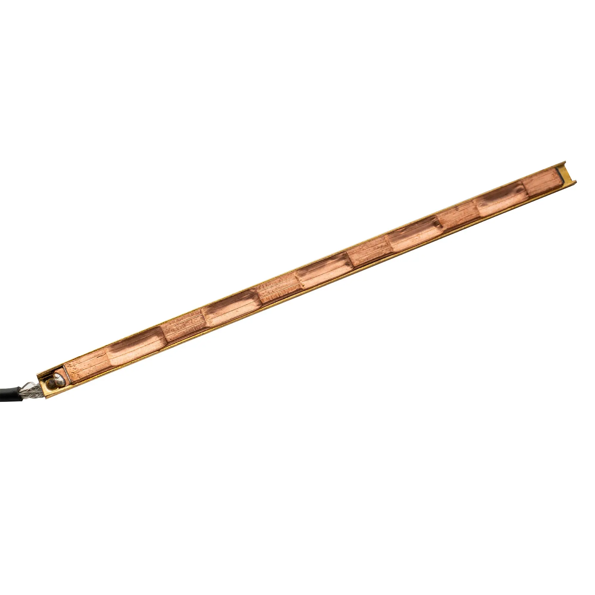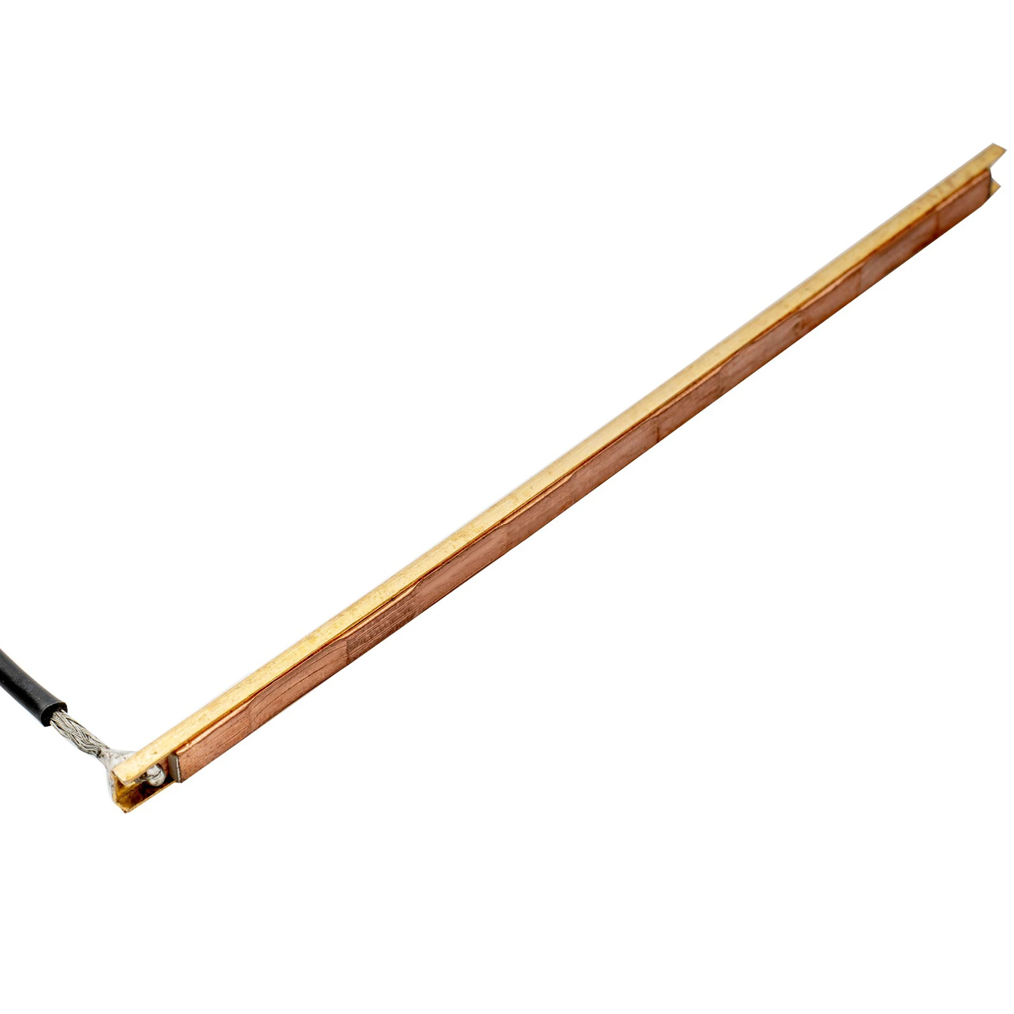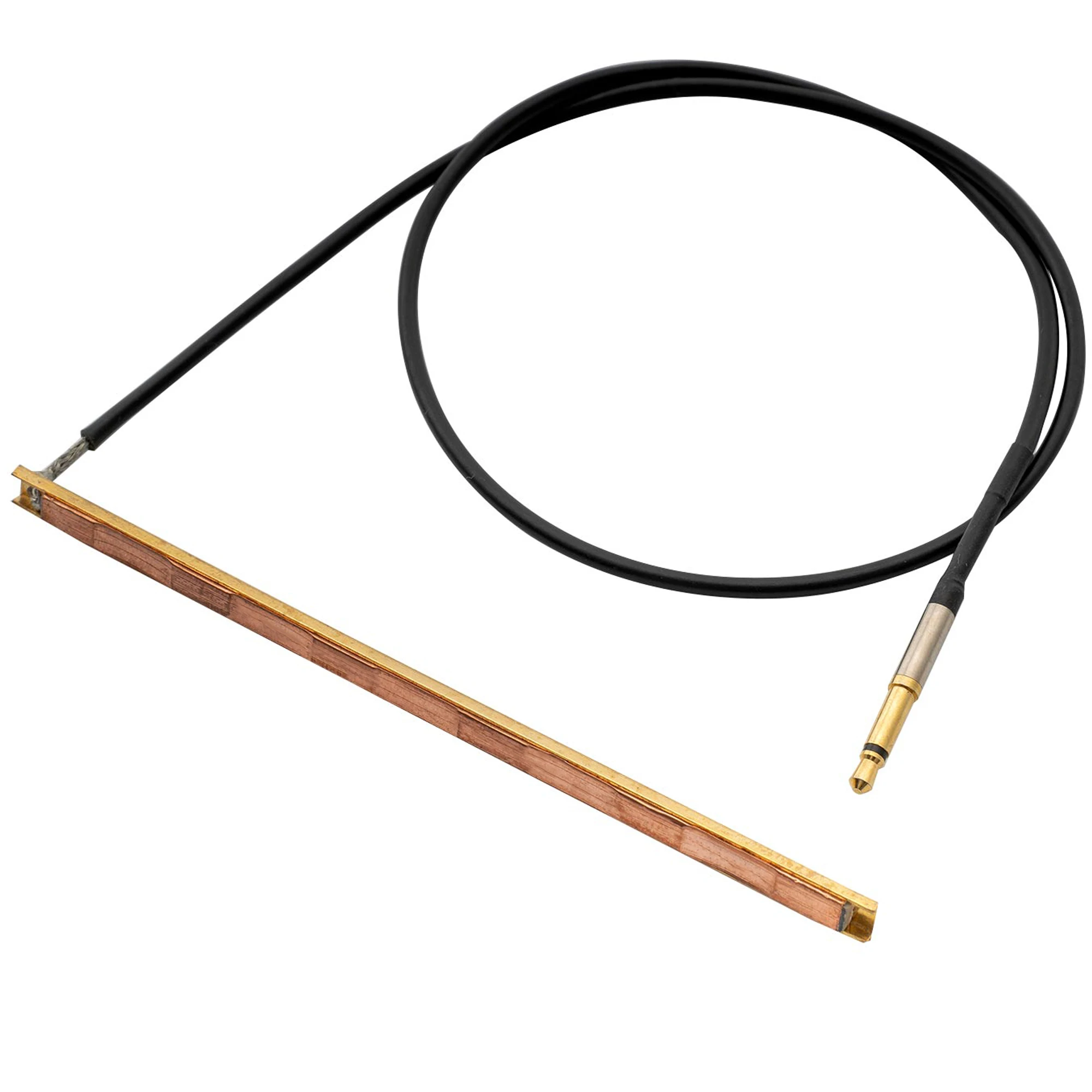 Experience premium sound quality with this this ceramic piezo pickup, specifically designed for 6-string acoustic bass guitars. Its sleek, rectangular metallic design, measuring 96mm in length and 4.3mm wide, offers a modern, minimalist look that complements your instrument effortlessly. The durable brass-like finish adds a polished, reflective touch, emphasizing clarity and precision. This pickup is engineered with piezo ceramic sensors for each string, ensuring a balanced, warm, and rich tone. The black Teflon-shielded cable extends 400mm for flexible installation, ending in a gold-plated 2.5mm jack plug that guarantees reliable conductivity. Its installation under the saddle requires no soldering, making setup quick, secure, and non-invasive. The overall design combines high functionality with refined aesthetics, delivering professional-grade sound without distractions.