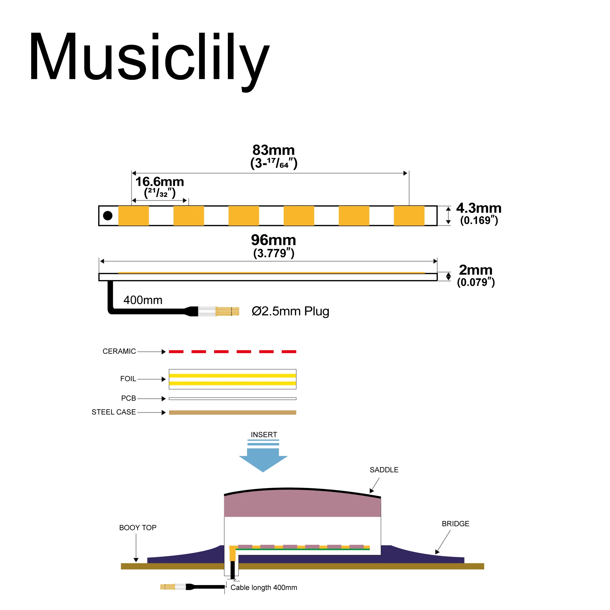 - Constructed with piezo ceramic sensors for each string, offering stable energy conversion, excellent temperature stability, and uniform sensitivity across all strings.