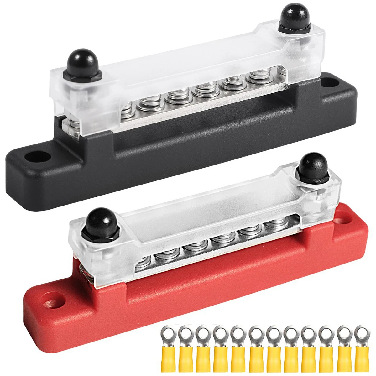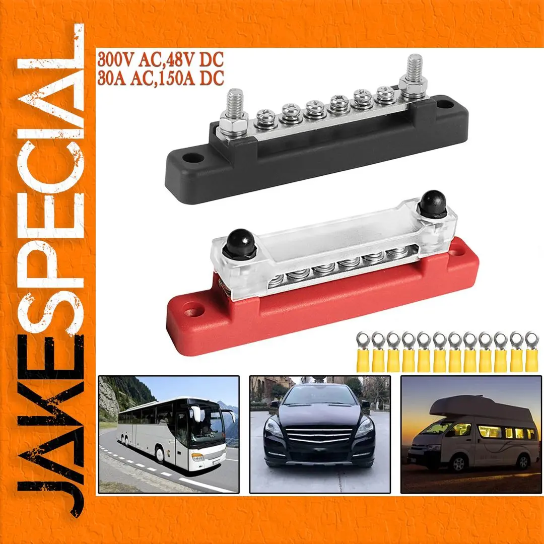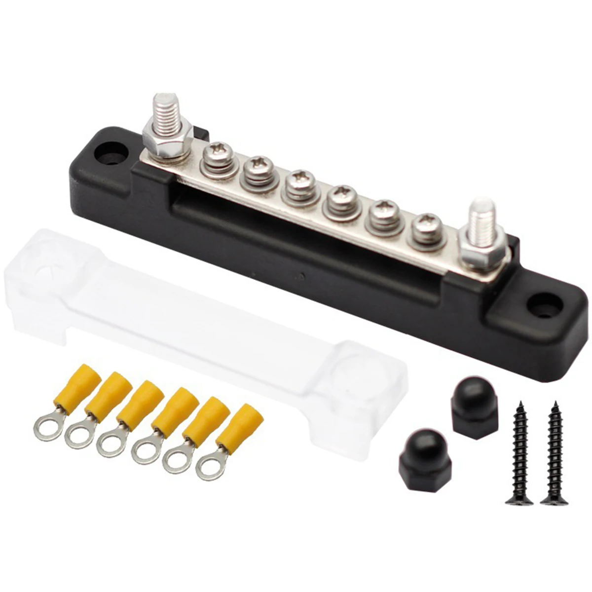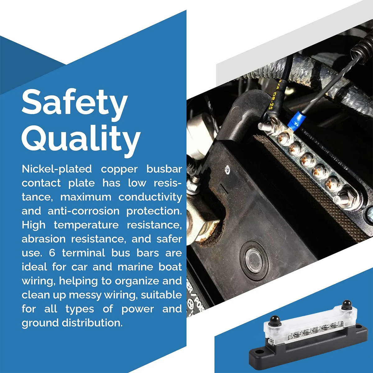 Experience reliable power distribution with this high-quality 6-way bus bar terminal block. Designed for versatility and safety, it offers excellent insulation, durable construction, and clear color-coding options for optimal circuit organization. Perfect for automotive, RV, boat, or industrial applications, this power distribution block allows you to manage electrical connections efficiently. Its sturdy nylon and stainless steel build ensures longevity, while the copper rods and stainless steel studs guarantee excellent conductivity. With the ability to handle up to 300V AC / 48V DC voltage and currents up to 130A AC / 150A DC, it delivers robust performance under demanding conditions. Secure your electrical system with confidence, thanks to the included hardware and thoughtful design features.