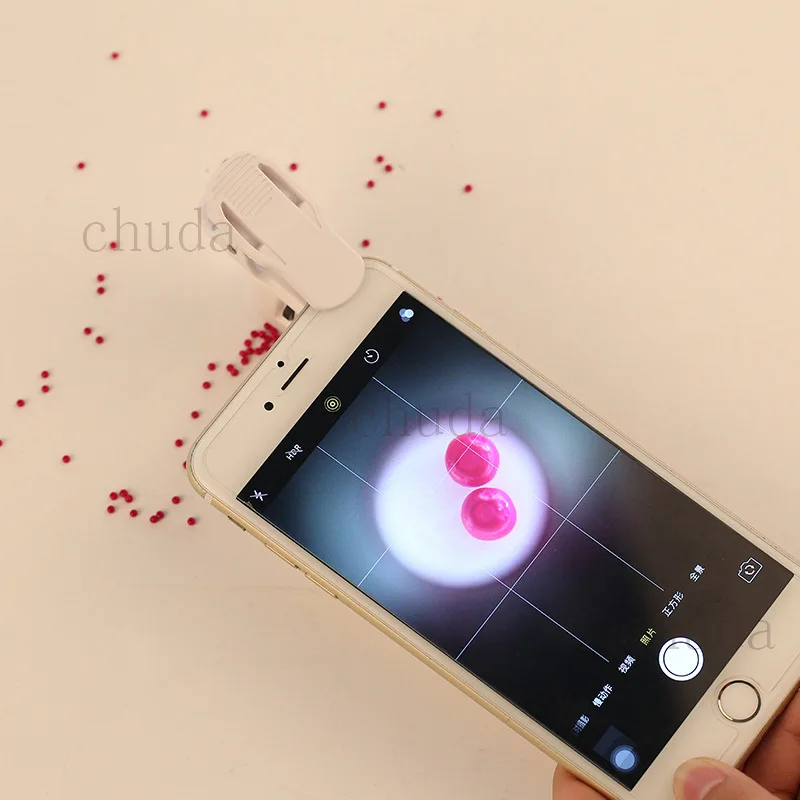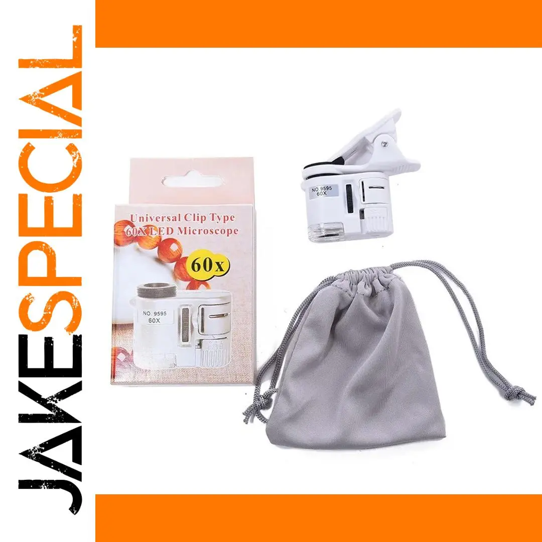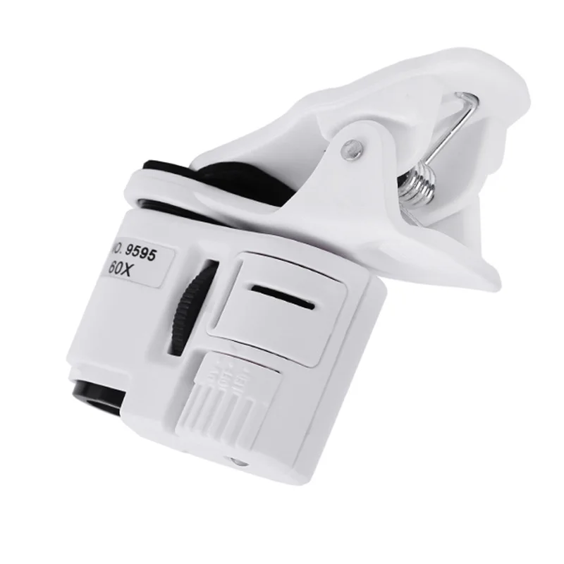 Transform your smartphone into a powerful microscope with this sleek, white 60X magnifier featuring an integrated LED light. Designed for practicality and precision, it easily clips onto your mobile device for quick setup. The magnifier's round lens provides clear, detailed views of small objects, making it perfect for jewelry inspection, money verification, or intricate craft work. The built-in LED ensures bright illumination even in low-light conditions, while the UV functionality helps authenticate currency and identify valuable jewelry. Its modern white plastic finish gives it a minimalist, contemporary look, complemented by a soft gray fabric pouch for safekeeping. Enjoy accurate magnification with this lightweight, portable accessory that seamlessly combines style and functionality for your everyday needs.