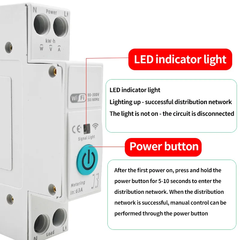 Experience seamless energy management with this state-of-the-art 63A intelligent switching power meter. Designed to integrate effortlessly into your electrical system, it offers WiFi connectivity for remote monitoring and scheduling. Its sleek, minimalist white plastic exterior fits seamlessly into modern spaces, while the prominent teal-colored power button provides a vibrant visual cue and easy operation. Small symbols for signal light and measurement units like kWh, W, V, and A are subtly embedded, enhancing readability without clutter. The device's compact, rectangular shape and recessed metallic terminals emphasize its technical sophistication and user-friendly design. Ideal for those who prioritize safety, efficiency, and smart control, this device transforms your electrical setup into a modern, connected system.