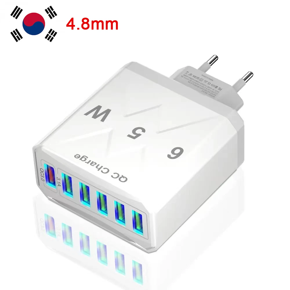 Construct your ideal travel setup with this versatile and sleek charger. Featuring six ports—four USB Type-A and two USB Type-C—it delivers a total power of 65W, ensuring rapid, reliable charging for all your devices. The elegant white matte finish combined with subtle angular design lines creates a modern, minimalist aesthetic. The colorful accents on the ports—green for USB Type-A and gray for Type-C—enhance durability and visual appeal. Designed for convenience, it supports input voltages of 100-240V at 50-60Hz, making it suitable for international travel. Whether you're charging phones, tablets, or other USB-powered devices, this compact charger seamlessly integrates function with style.