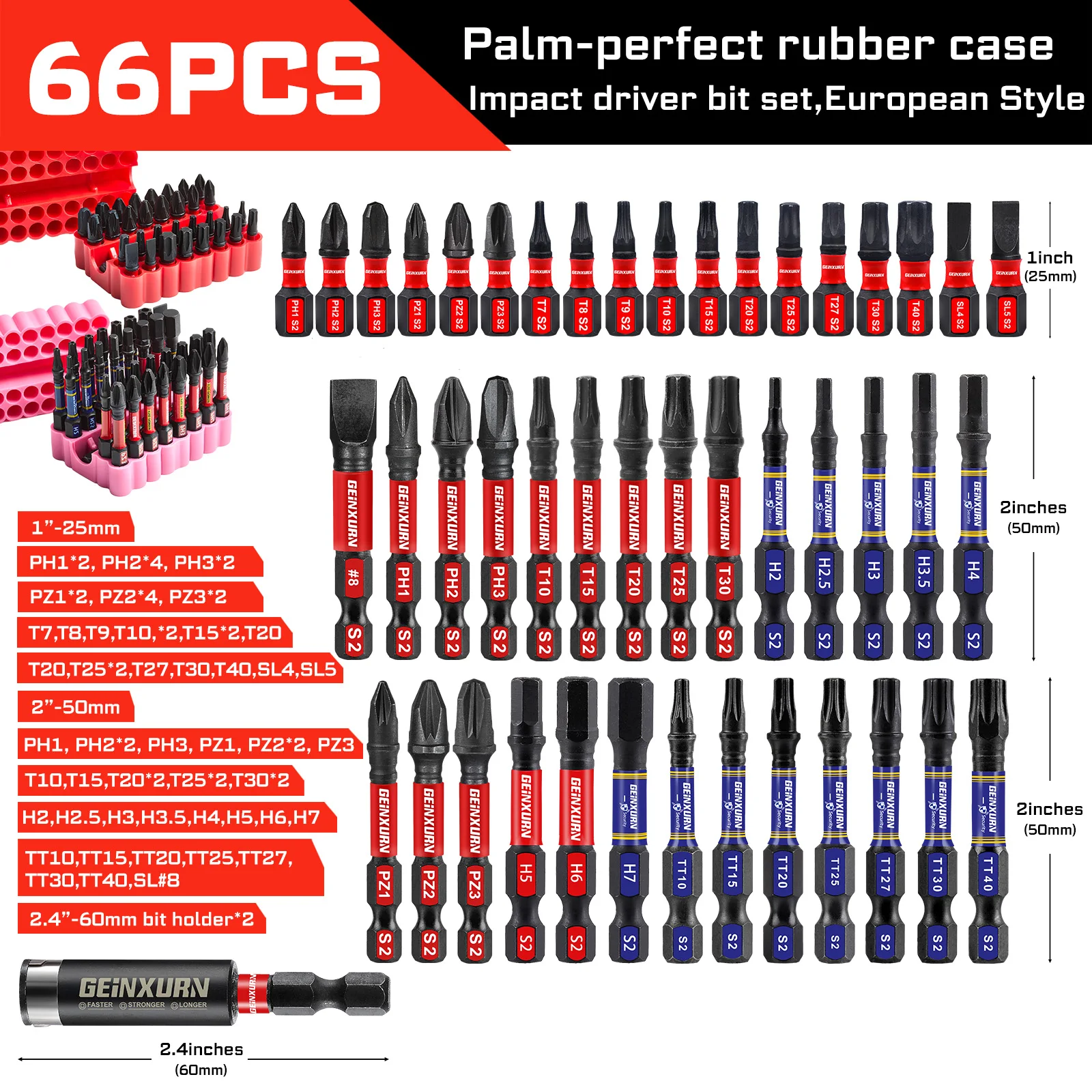 - This set includes 66 premium impact bits made of durable S2 alloy steel, offering high hardness, toughness, and resistance for demanding industrial applications.