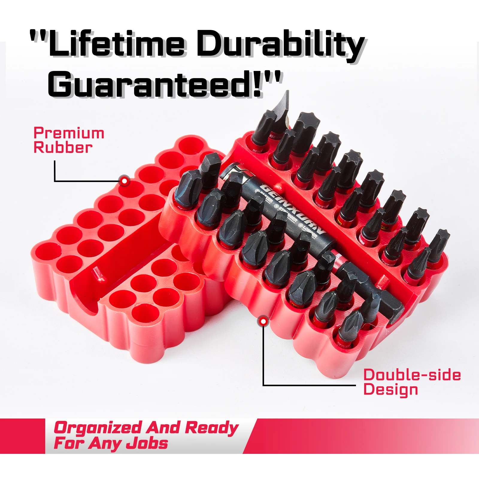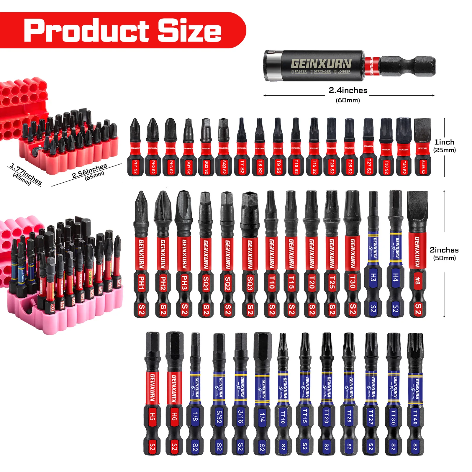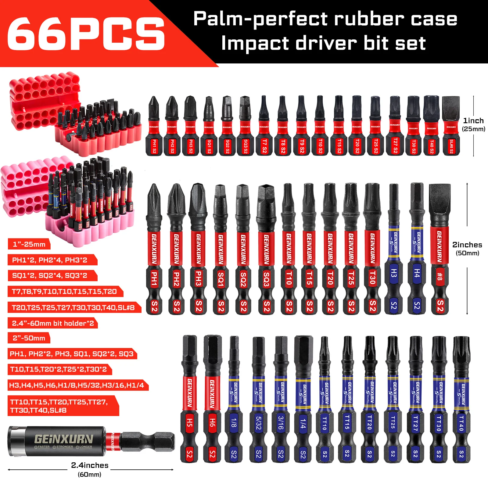 This 66-piece impact screwdriver bits set features high-durability S2 alloy steel bits in three sizes: 1 inch (PH1, PH2, PH3, SQ1, SQ2, SQ3, T10, T15, T20, T25, T30, T27, T40), 2″ (including PH, SQ, T, H, and SL bits), and a 2.4-inch magnetic bit holder for easy screw handling. Designed for industrial and DIY use, the bits offer high hardness, toughness, & resistance thanks to strict heat treatment. Their magnetic tips, precise machining, flexibility, and unbreakable construction ensure safety, efficiency, and long-lasting performance. The set is portable, lightweight, ergonomic, and easy to organize, making it perfect for versatile applications.