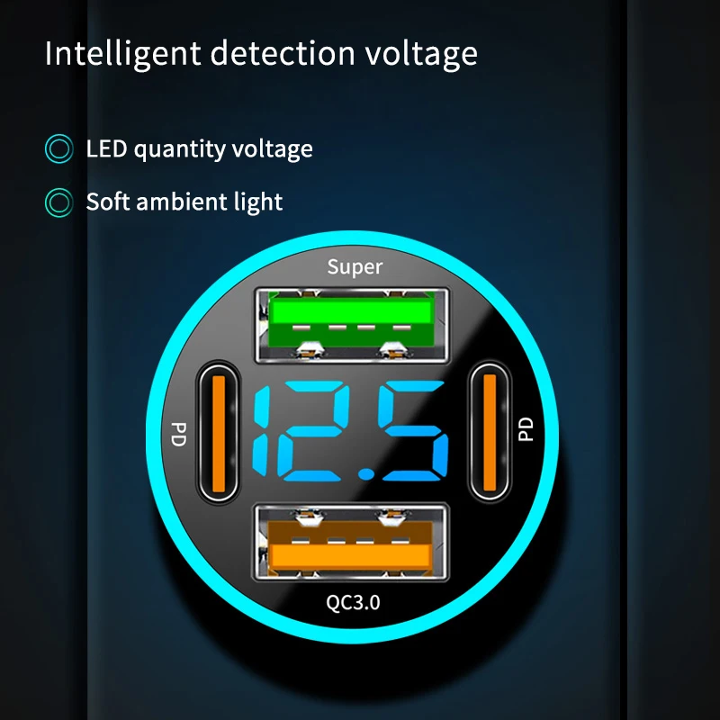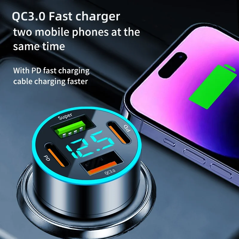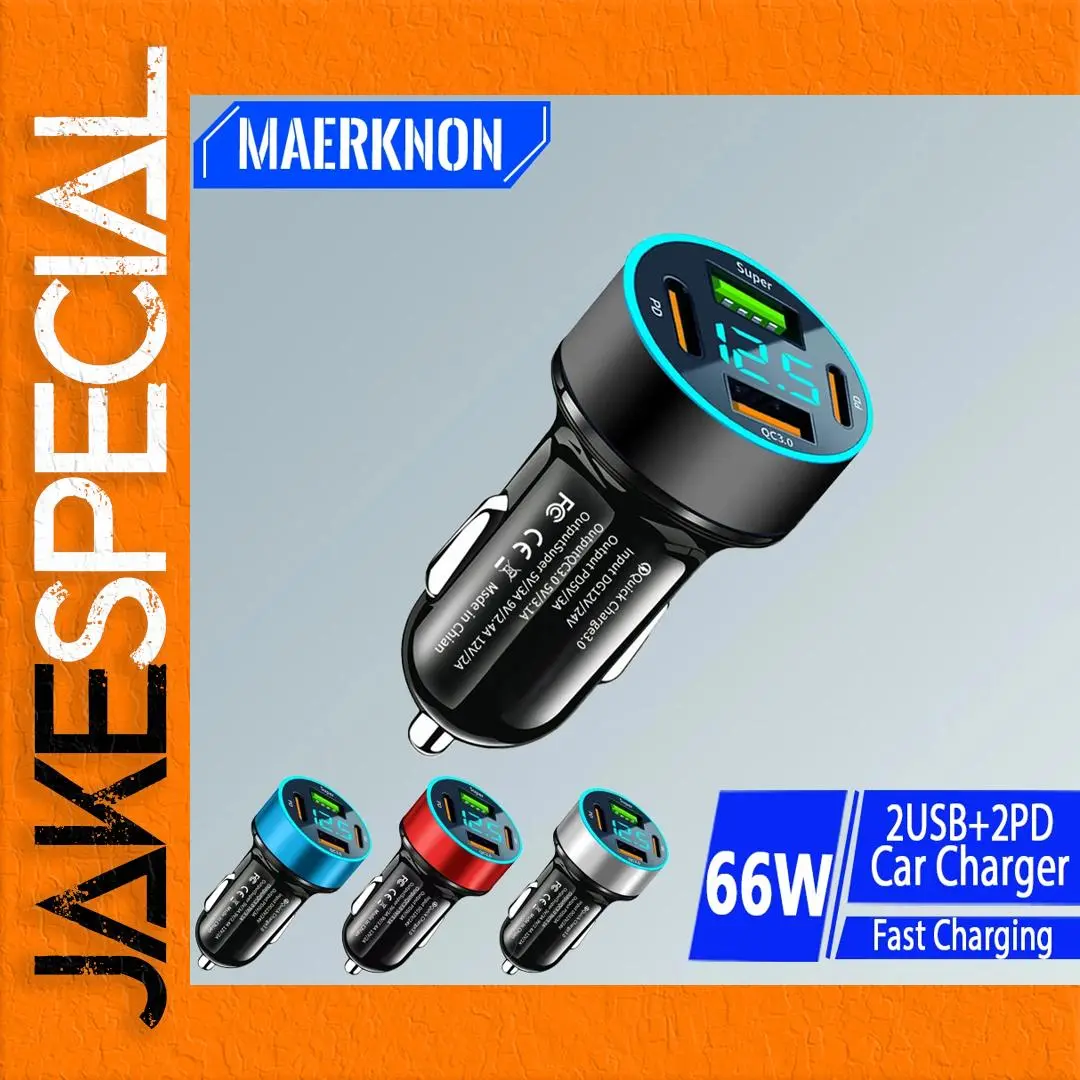 Experience the ultimate convenience on the go with this 66W USB Car Charger, specifically engineered for fast and efficient charging of your devices. The sleek black body, complemented by vibrant accent colors, houses four total ports—two USB Type A and two USB Type C—allowing you to power multiple devices simultaneously. The round display screen not only looks modern but also provides insight into your charging status, while the QC3.0 technology ensures rapid charging for all compatible devices. Ideal for iPhone, Samsung, Huawei, and Xiaomi users, this portable charger is a must-have accessory for any car owner.