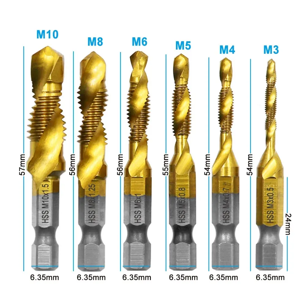 Upgrade your toolkit with the 6pc Titanium Coated Composite Tap Set M3-M10, expertly crafted for efficiency in drilling and tapping. This set features high-speed steel taps with durable titanium plating, making them ideal for various applications, including wood, aluminum, and thin metal plates. The hexagonal shank design ensures a secure fit, allowing you to tackle projects with confidence. With six essential sizes, this versatile set is perfect whether you’re a DIY enthusiast or a professional. Imagine completing your next project effortlessly—get ready to elevate your craftsmanship with this reliable tap set!
