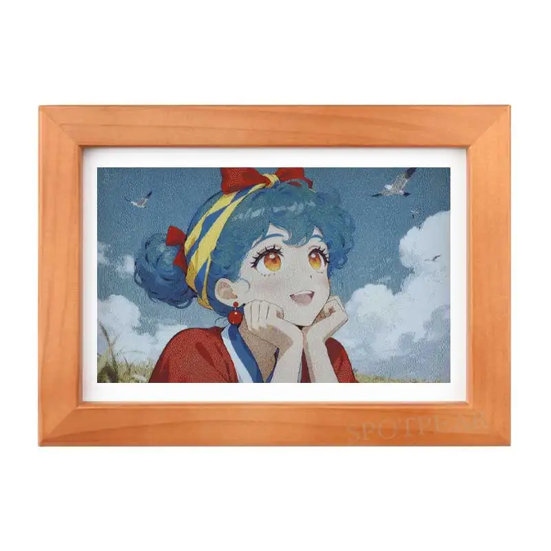 - 7.3-inch E6 full-color e-paper display supports six primary colors with Dithering for vibrant, saturated images. Measures 7.3″ diagonally, housed in a solid wood frame for elegance.