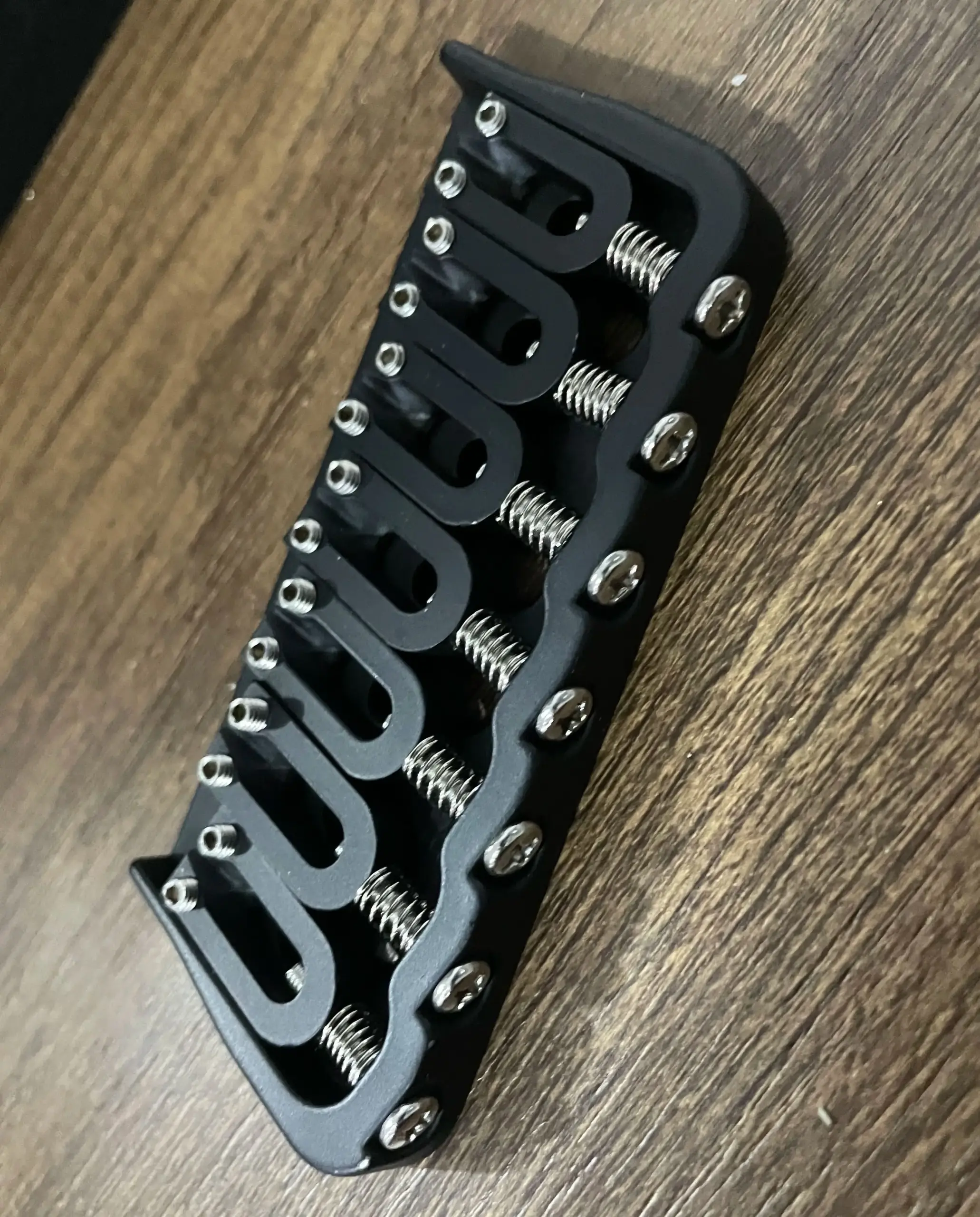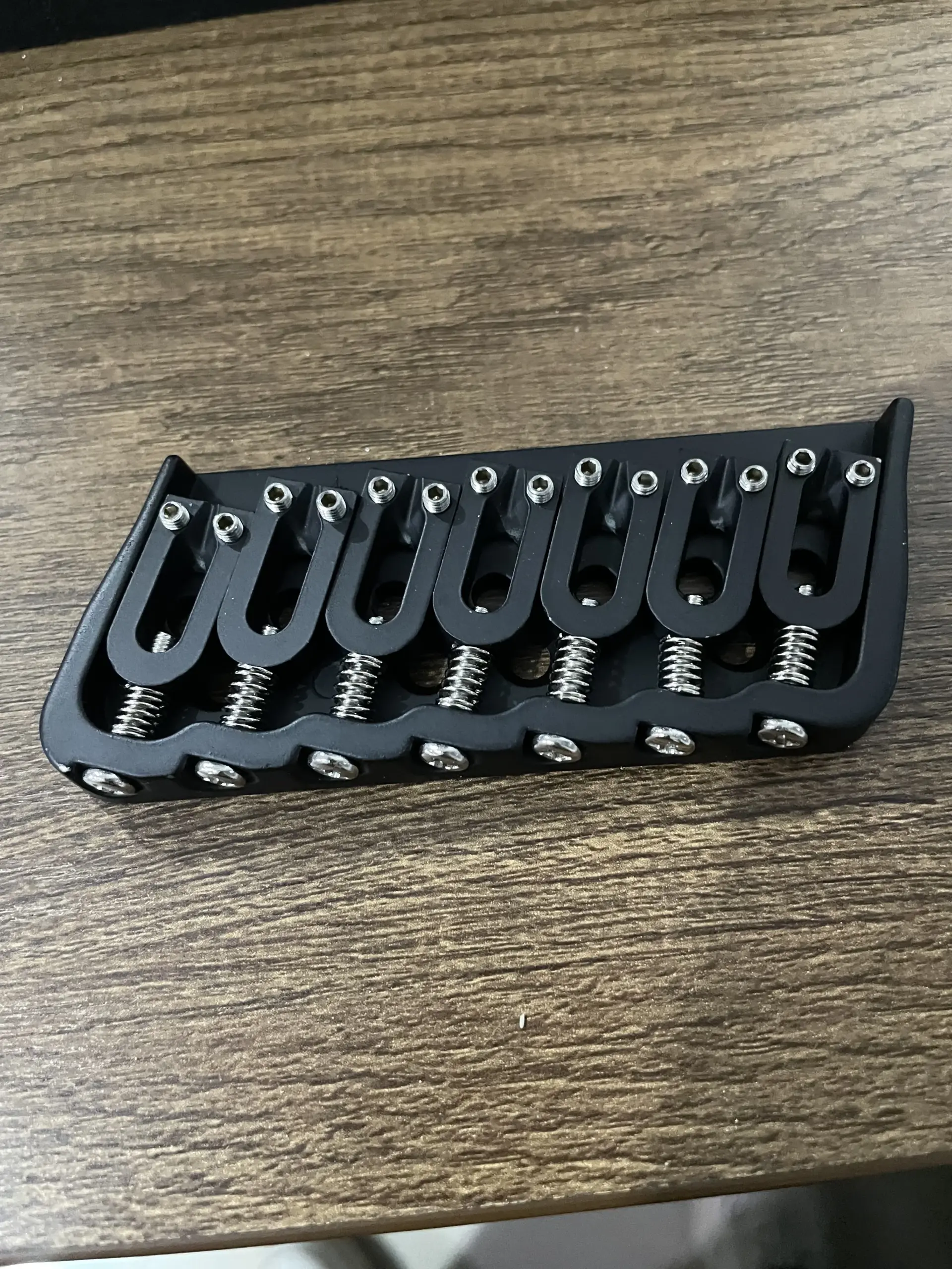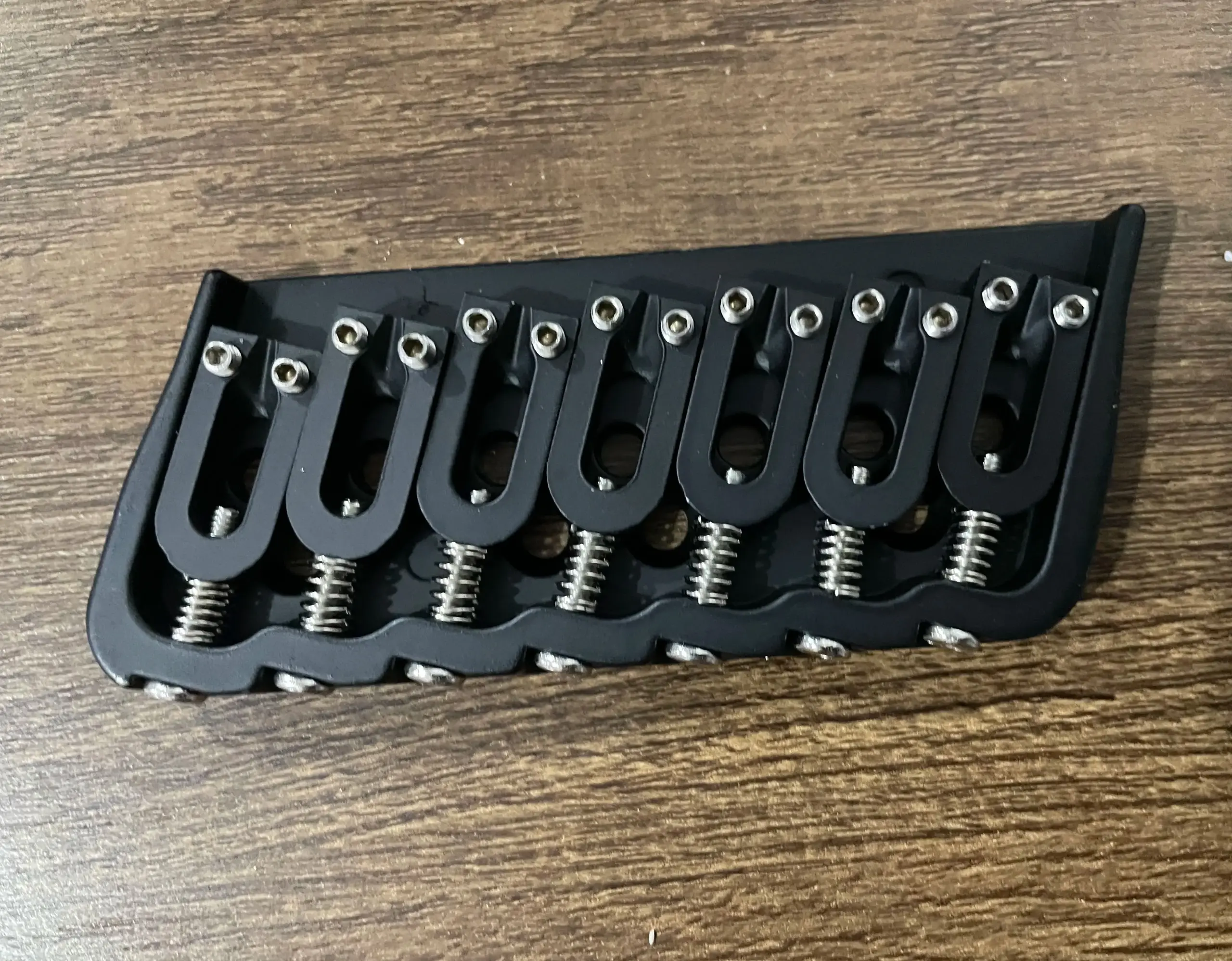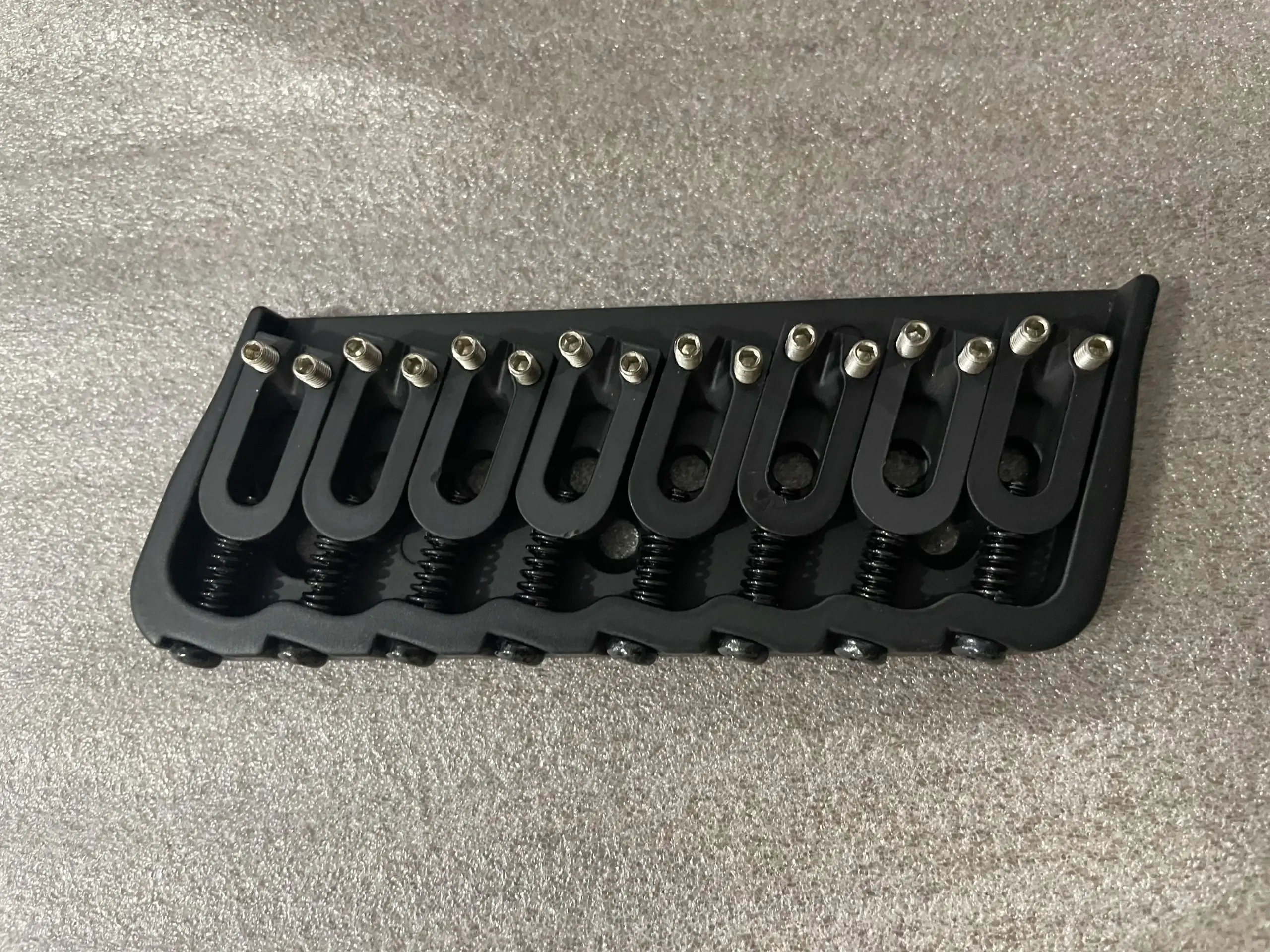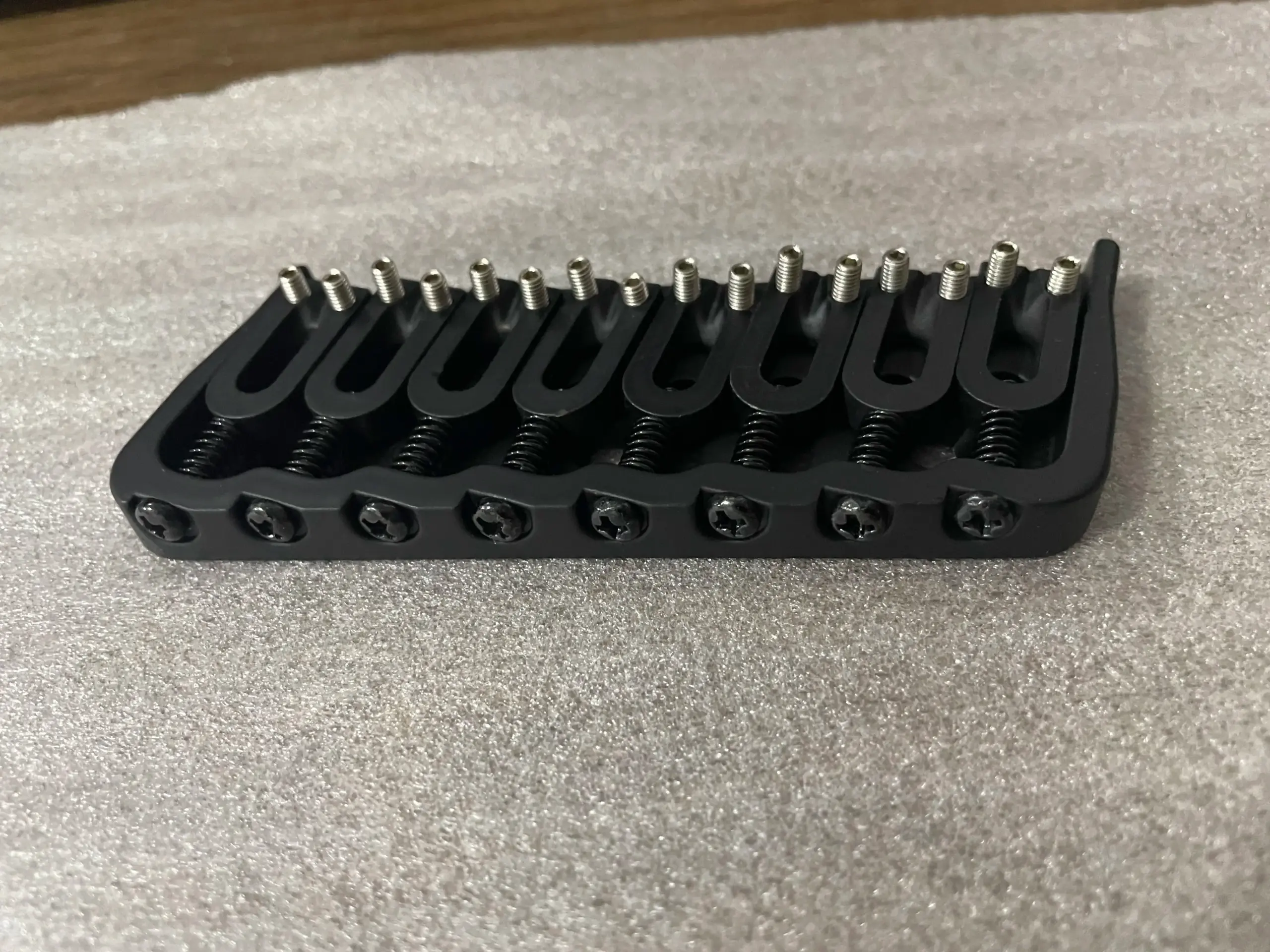 Imagine upgrading your electric guitar with this sleek, black fixed bridge that brings both style and precision to your instrument. Designed for 7-string and 8-string models, this durable metal component features a modern, rectangular shape with softly rounded edges, offering a clean and sophisticated look. The fanned fret configuration ensures optimal string alignment across the fretboard, resulting in better playability, improved tuning stability, and richer sustain. Its matte black finish exudes a professional appeal, while the sturdy construction guarantees long-term durability. Whether you're customizing your guitar or replacing an existing part, this bridge provides the technical flexibility you need to elevate your playing experience to a higher level of comfort and performance.