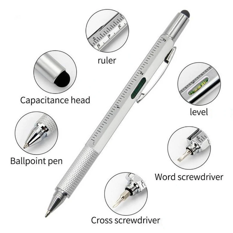 The 7 in 1 Multifunctional Handheld Tool Pen combines practicality and style in one sleek design, measuring 14.9 cm in length and 1 cm in diameter. This versatile tool includes a stylus, bubble level, ruler (in inches and centimeters), and both slotted and Phillips screwdrivers, featuring 12 cm screw heads. Made from a durable aluminum-copper alloy with a metal shell, it is available in vibrant colors: Blue, Yellow, Silver, Red, and Black. Weighing only 1.0 ounces, this lightweight pen ensures a smooth writing experience, making it perfect for DIY projects and everyday tasks while easily fitting in your pocket or tool belt.