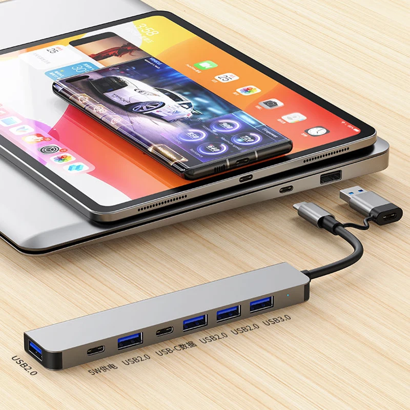 Experience seamless connectivity with this sleek and stylish 7-in-2 USB hub from OULLX, designed to enhance your digital workspace. Its modern, elongated rectangular shape features a smooth metallic silver or light gray finish that complements any device setup. A subtly curved top surface adds a touch of elegance, while a contrasting black cable extends from the top, providing a striking visual appeal. Equipped with seven ports—including a vibrant blue USB 3.0 port, USB-C port, and USB 2.0 port—this hub offers versatile data transfer options. Its compact size fits comfortably on any desk or portable setup, making it ideal for professionals and enthusiasts alike. Whether at home, office, or on the go, this hub provides reliable, fast connectivity for all your external devices, ensuring your workflow remains smooth and efficient.