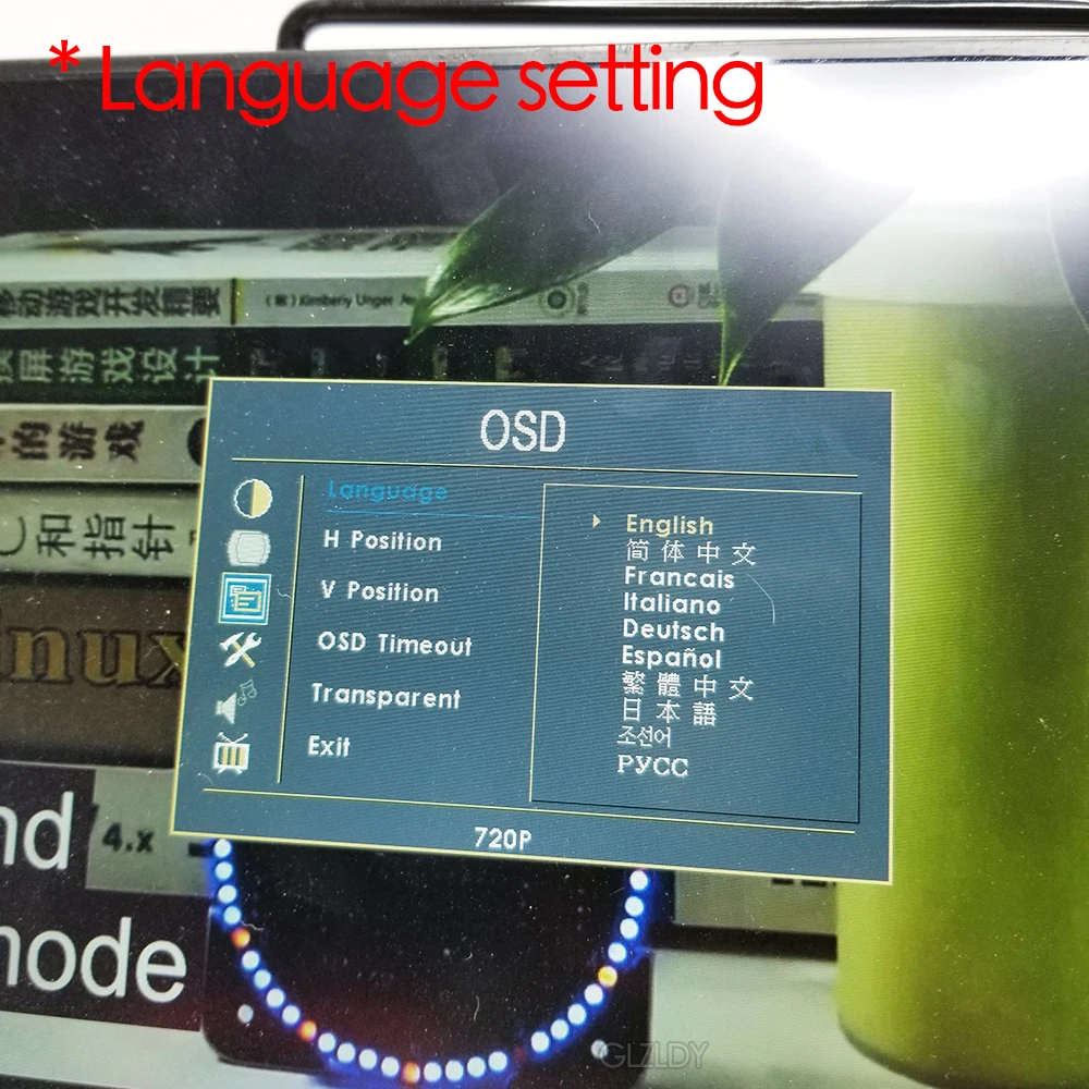 - Offers on-screen display (OSD) functions like brightness, contrast, and multilingual language settings (English, French, German, Spanish, Italian), enhancing user experience.