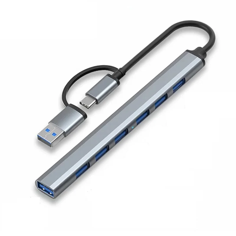 Experience seamless expansion of your device's USB capabilities with this modern, high-quality USB hub. Crafted with an elegant elongated aluminum shell in a metallic gray finish, it combines durability with style, making it a perfect addition to your tech setup. Featuring dual connectors—one Type C and one standard USB 3.0—this hub provides flexible connection options. Its compact, lightweight design with a 6.5 cm black cable makes it easy to transport and set up anywhere. You’ll enjoy rapid data transfer speeds and reliable performance whether you're using it with tablets, keyboards, mice, USB disks, or laptops. A sleek integration of form and function, this hub is your reliable solution to connect multiple devices effortlessly.