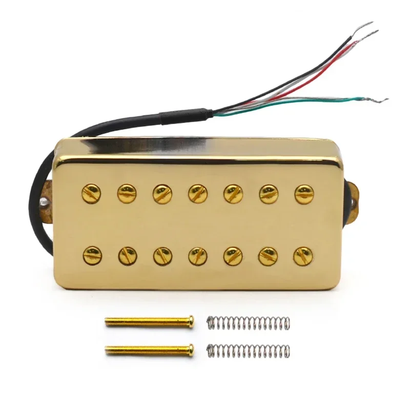 Experience exceptional sound and durability with this high-performance 7-string guitar humbucker pickup. Designed for both professional musicians and enthusiasts, its sleek rectangular shape features a striking brass or chrome finish that adds a touch of sophistication to your guitar. The black metal top is reinforced with dual in-line slotted screws, providing precise height adjustment and a rugged industrial look. The internal components include a gold-colored baseplate with multiple pole pieces, some topped with black screws, offering a perfect balance of aesthetic appeal and functional accuracy. This pickup’s versatile design ensures optimal magnetic interaction, delivering rich, dynamic tones for a variety of musical styles. Trust this pickup to enhance your guitar’s sound and style effortlessly.