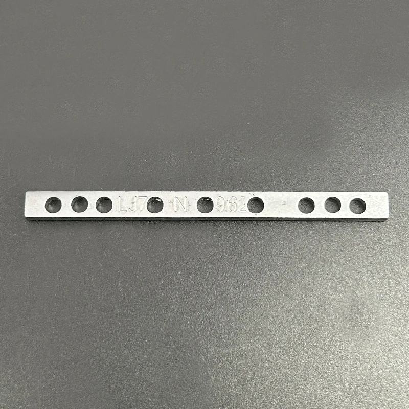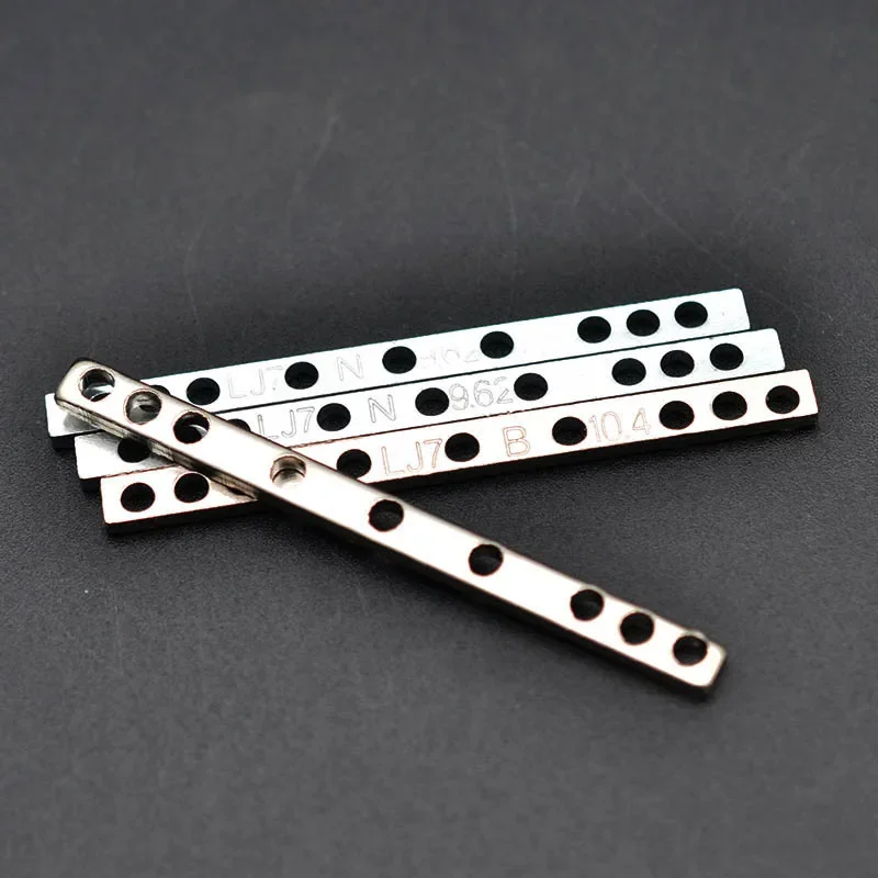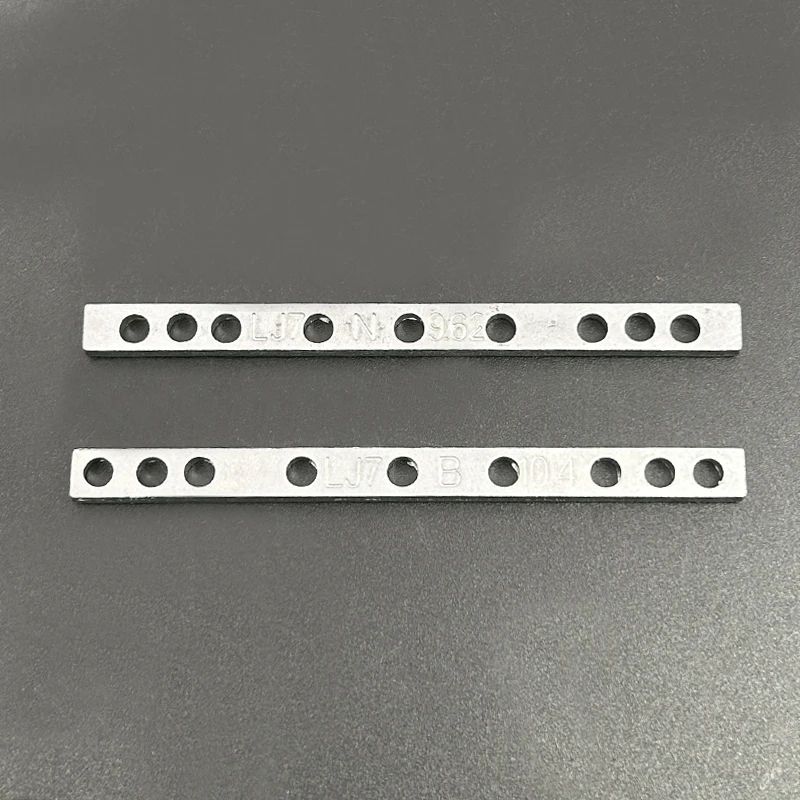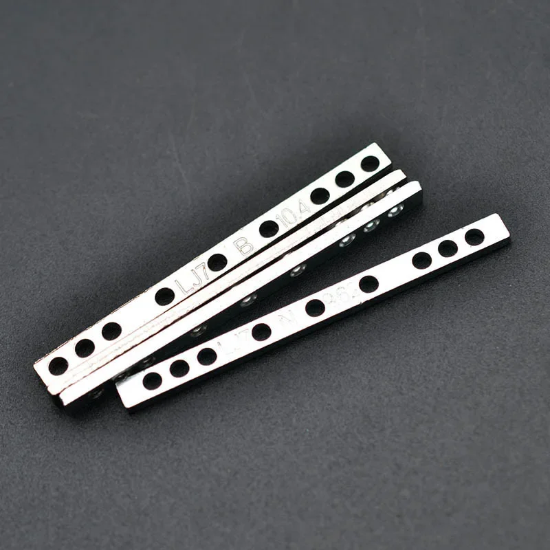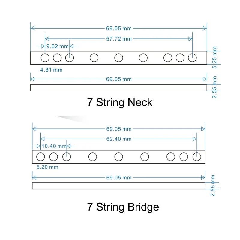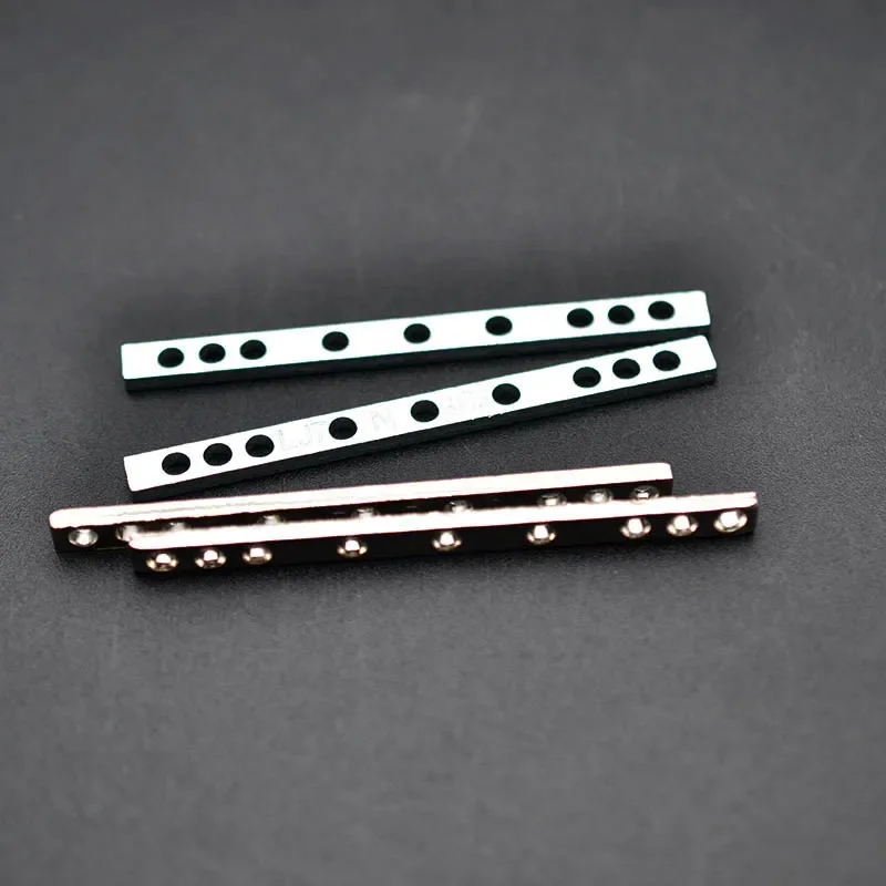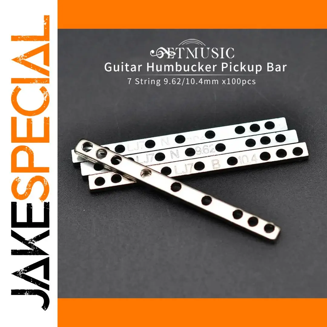 Enhance your guitar customization with this set of 100 high-quality iron spacer bars designed for 7-string humbucker pickups. Crafted with a sleek, shiny silver finish, each bar features precisely spaced circular holes for optimal mounting and adjustment. The spacers come in pole spacings of 9.62mm and 10.4mm, with any combination available to match your specific setup. Measuring as shown in reference images, these durable, polished bars ensure accurate alignment for both neck and bridge positions. Perfect for guitar repair or manufacturing, their refined design and technical precision make them an essential addition for serious instrument enthusiasts.