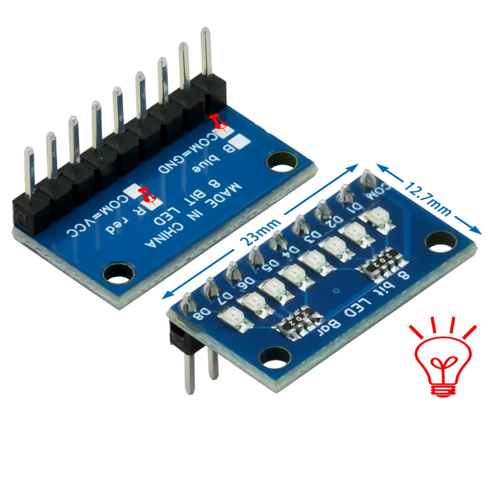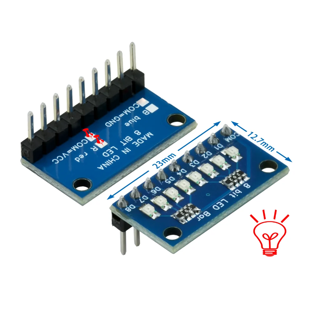 Discover how this 8-bit LED indicator strip elevates your projects with its sleek and efficient design. Featuring a vibrant blue and red color palette, this module provides clear digital signals for your control panels, prototyping, or automation tasks. Its compact size, measuring only 22.86mm in length, 14.13mm in width, and 2.11mm in height, makes it perfect for tight spaces. Its sturdy construction includes mounting holes at opposite corners, ensuring secure placement on any surface. With a user-friendly 2.54mm interface, it easily plugs into breadboards or can be soldered directly into circuits. The lightweight design, weighing just 1.3 grams with pins, provides a stable, visually appealing indicator solution for various digital applications, from home automation to industrial controls.