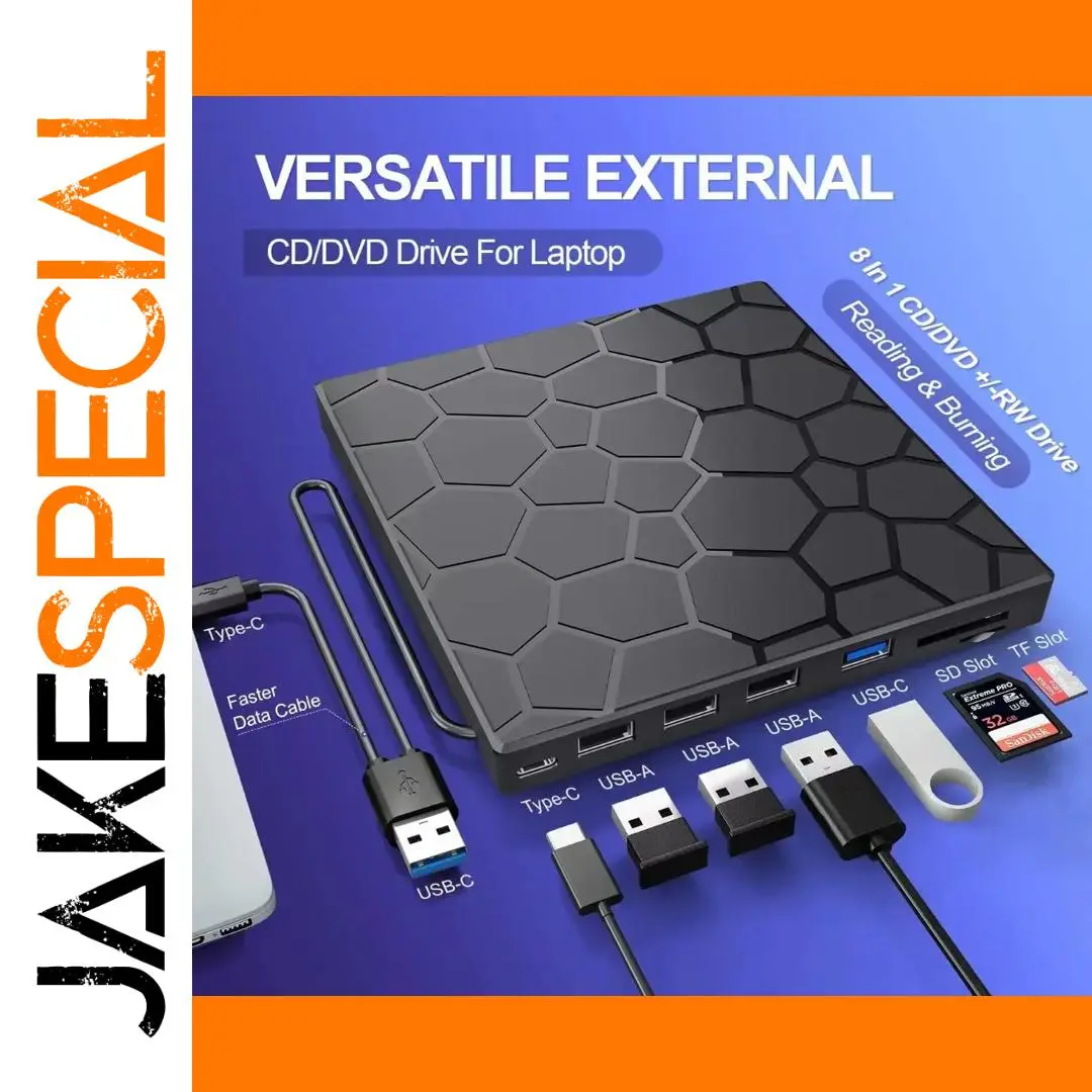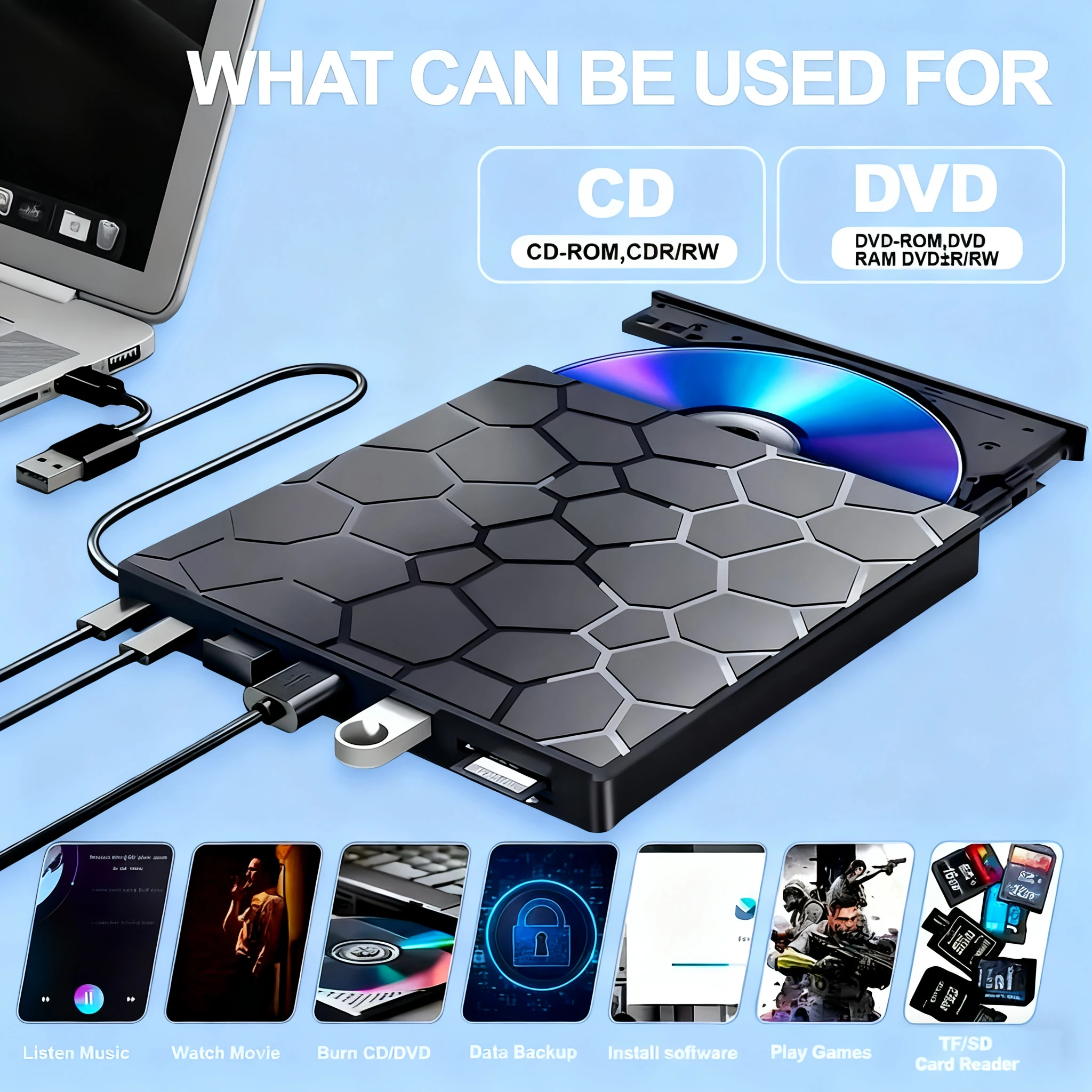 Experience seamless data transfer and disc management with this sleek, black design external DVD drive. Its modern, geometric hexagon pattern adds visual interest to its minimalist, professional look. Perfect for those who value both style and function, this device combines high-speed performance with multiple connectivity options—including USB 3.0, USB-C, and three USB 2.0 ports. Its lightweight, portable form factor makes it easy to carry and connect on the go, turning your laptop or desktop into a multi-functional media hub. Whether you're reading, burning, or archiving, this external drive offers reliable, efficient performance designed for long-term data storage and quick access. It’s the ideal tool for professionals and casual users alike seeking a durable, versatile optical solution.